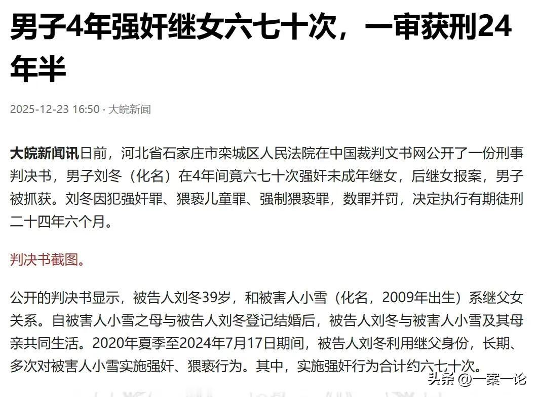 河北石家庄,继父在4年内,居然对未满14岁的继女,侵犯了差不多70次,初犯时,在继女11岁,继女还小,无以反抗,在她14岁时,她终于知道继父的行为是违法的,这才报了警。 回想起自己的遭遇,小雪早已泪流满面,差不多70次的侵犯,每一幕都让她不堪回首,每一幕都让她痛苦不已,更是刻进了她的骨髓里,让她时时刻刻为自己感到耻辱。 刚开始的时候,小雪才11岁,她对继父的行为懵懵懂懂,只知道继父欺负她了,继父的行为是不对的,可她又不知道如何去反抗。 毕竟继父平时对她挺好的,她底下还有一个弟弟妹妹,是继父亲生的,继父对待她,和对待弟弟妹妹是一样的,她找不到什么理由来反抗继父,也不知道继父为何要这样对她。 她只知道,继父威胁她,如果把这件事说出去,就让她回老家自生自灭。 11岁的小雪,在很小的时候,就已经和继父生活在一起了,继父在她心中,就是一个父亲,父亲想对她怎样,似乎她没有理由说不。 但才11岁的小雪,她很清楚,继父这样做是不对的,她尝试过反抗,可是继父威胁她,还要休了她的母亲,让母亲带着她,还有弟弟妹妹,一起去吃苦。 小雪是姐姐,她舍不得母亲吃苦,更舍不得弟弟妹妹吃苦,她想着自己最爱的母亲,最终还是忍气吞声,将这一切都承受下来。 这一承受就承受了4年,她从2020年的夏天,到2024年的7月17日,小雪记得清清楚楚,她被继父实施那些行为已经差不多70次了,每一次她都难以承受,事后都会很痛苦。 这4年里,她不止一次地想将自己的遭遇告诉母亲,或者告诉别人,她更想报警,可一想起继父的威胁,她就感到恐惧。 直到2024年的7月17日,小雪已经14岁了,她已经意识到她和继父之间的事情,是多么的不耻,她更意识到继父的行为就是违法的。 她实在难以忍受继父对她的所作所为了,她已经是个大女孩了,将来会结婚生子,如果继父没有停止这样的行为,将来她又该如何谈男朋友,又该如何结婚生子。 她深刻地意识到,现在她再不反抗,再不报警,她的痛苦会一直继续,终于选择了报警。 当她的母亲知道女儿遭遇这样的事,她母亲说,她在小雪两岁半的时候,就已经和丈夫结婚了,结婚之后又生了一对儿女。 丈夫对待这对儿女,和对待她的大女儿是一视同仁的,她一直都看到丈夫对大女儿很好,所以从来没有想过这方面的事情,小雪也没有跟家人说过这件事,她也没有亲自见过,她一直都只觉得丈夫对小雪很好,所以不知道这件事情。 发生这样的事,小雪的母亲也难以接受这样的事。 而小雪的继父刘冬是这么说的,因为小雪不是亲生的,所以他才会寻求刺激,才会侵犯小雪,反正小雪也不敢报警,所以他才会得寸进尺,一次又一次地侵犯小雪,根本不在乎小雪的年纪小,也不会在乎小雪的反抗。 看到小雪的遭遇,不少人觉得小雪的母亲实在太大意了,自己的大女儿和丈夫,毕竟没有血缘关系,她怎么能不关注女儿的情绪呢!就是小雪母亲的不作为,所以才导致小雪一次又一次地被侵犯。 可怜的小雪,第1次的时候,才11岁,为了母亲,她选择了沉默,她也在继父的威胁中,恐惧地生活着。 没人知道,才11岁的她,到14岁之间,这4年,她是怎么过来的,每一次的遭遇都是她内心的创伤,谁也不知道这些创伤是否有愈合。 仅仅4年的时间,就差不多70次,几乎每个月都遭遇这样的事,这对小雪造成的阴影,或许将会跟随她一辈子。 如今小雪终于醒悟过来,选择了报警,她要追究继父的责任,她要让继父受到应有的惩罚。 小雪做出这个决定,下了很大的决心,或许她受到的伤害实在太大了,实在太令她气愤,她才会忍无可忍了,她才会选择报警。 小雪从11岁到14岁,这4年间,小雪都没有满14岁,她继父的行为已经构成了强奸罪。 《刑法》第236条规定:以暴力、胁迫或者其他手段强奸妇女的,处三年以上十年以下有期徒刑。 奸淫不满十四周岁的幼女的,以强奸论,从重处罚。 强奸妇女、奸淫幼女,情节恶劣的,处十年以上有期徒刑、无期徒刑或者死刑。 4年间,差不多70次,并且刘冬是利用自己的身份对小雪进行侵犯的,他的行为非常恶劣,应当严惩刘冬。 除此之外,小雪11岁时还是个儿童,他就遭遇了这样的事,刘冬的行为同样构成了猥亵儿童罪,以及强制猥亵罪。 如此情节恶劣,法院判决刘东犯强奸罪,猥亵儿童罪,强制猥亵罪,被判处有期徒刑24年6个月。 他将会受到应有的处罚,这倒是苦了小雪的母亲,她将要一个人拉扯三个孩子长大,不知道她是否会怨自己的大女儿,但小雪肯定不会后悔报警,或许她拿出了自己所有的勇气,才下这个决定。 那么你对小雪的遭遇有何看法呢?小雪为化名