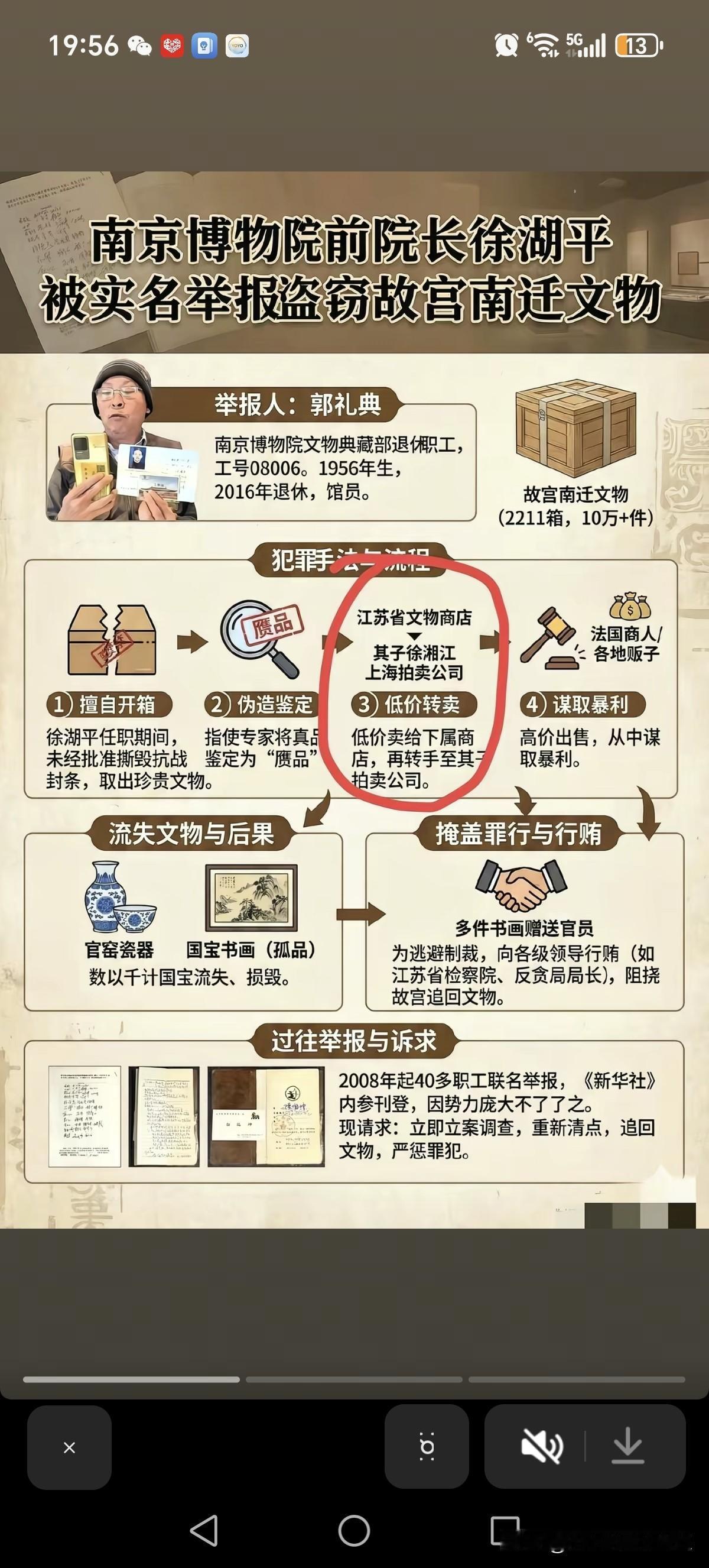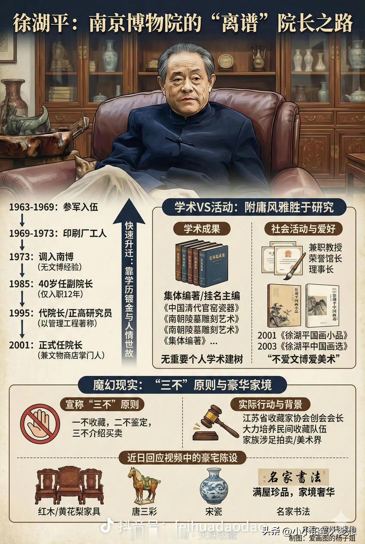 看了一下南京博物院副院长徐湖平的升迁之路,简直惊呆,真的是充满戏剧性啊,他高中毕业之后就去参军了,参军6年,复员后进厂当了4年的印刷工。 到了1973年,因为身体原因,被调进了南博的后勤部,主要的工作是负责车票预订,报销统计等业务。 因为他是党员然后就升迁为干部了。 又恰逢两位南博的院长相继离世,然后他们的工作就陷入了停滞,这个时候,徐湖平就主动承担了挖掘考古相关的工作。 他从一个印刷工然后进入南博,仅仅用了6年就成功逆袭成为一位副院长。而南博在长达16年没有正院长的头衔,他虽然身居二把手的位置,但却掌控着南博的命脉!同时但他还是江苏文物总店的法人,还担任江苏省收藏协会的会长,所以他跟多名著名的收藏家有密切的联系,他们常常待在一起研究和品鉴名画真迹。 而他的儿子徐湘江,在他在位置期间就成立了2所拍卖公司,他掌权,儿子就经商了,他一手管藏,一手管流通。 他儿子靠的文物收藏鉴定与拍卖吃饭,靠山吃山,靠水吃水,上阵父子兵啊,背后全都是他老爹在兜底一条龙服务,权力闭环直接拉满! 而这个事情南博的人也清楚,早在十年前南博员工郭礼典就写过举报信,举报他把藏品变为赝品,然后从他主管的文物总店以低价的方式流出,然后再转手倒卖给上海他儿子开的那个拍卖行,然后流通到国内外市场。举报这么多年,人安然无恙,而这一次是因为庞家后人把事情闹大了,郭礼典又把这个事情给爆出来了,所以引起了巨大的舆论和上级的关注!这背后的利益链才被曝光。 其实想想真的搞笑,一个业余高中生!能当博物馆长!难道整个江苏半个世纪没有一个专业人员来承担南博院长的职责。 还好,现江苏省政府已经成立了调查组,对南京博物院开展全面的调查!而国家的文物局也已经赶往南京了,这事退休也跑不脱了!