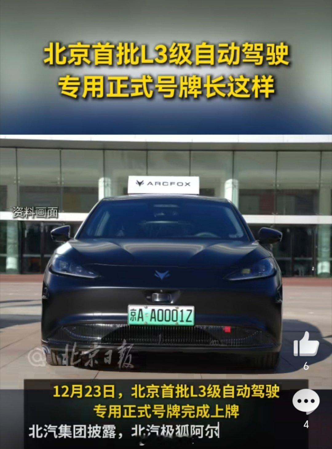 首批L3高速专用号牌什么样北京首批L3级自动驾驶专用号牌落地太让人振奋了!北汽极狐阿尔法S(L3版)7天内完成准入到上牌,还标配激光雷达保障安全,妥妥的技术硬实力。和L2级不同,L3能让驾驶员在高速场景暂时脱离驾驶任务,虽需随时接管,但已是从辅助到自动驾驶的关键跨越。这波试点不仅给智能驾驶落地探了路,也让未来出行更值得期待!