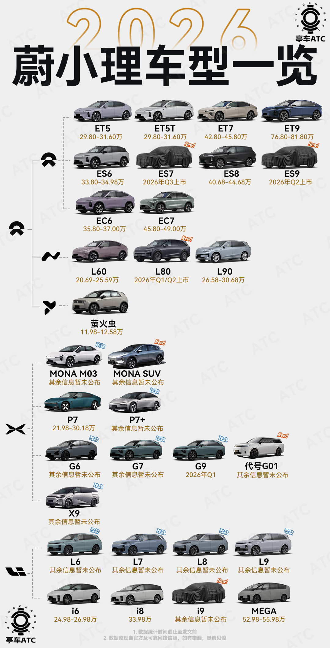把这张 2026 蔚小理车型一览表摊开来看,其实能清楚看到三家走到今天,思路已经彻底分叉了。蔚来这边,最大的变化不是车型更多,而是“层级”更清晰了。ET、ES、EC三条主线继续往上拔高度,ET9、ES9这种车已经不再纠结销量意义,更像是品牌天花板的存在,用来稳住形象和技术话语权。与此同时,L60、L80、L90的出现,说明蔚来也终于接受现实:光靠高端撑不住体系,必须要往主流价位下沉,而且是成体系地下沉。这种“高端不放、走量不躲”的双线打法,风险不小,但至少方向是对的。理想的路线相对简单粗暴,也最“理想”。L6到L9基本覆盖了家庭用车最主流的价格带,产品逻辑高度统一,配置和体验不断微调升级,几乎不分心做别的。i6、i8、i9和MEGA补齐纯电,但整体依然围绕“家庭”这一个关键词展开。它不追求花样,而是把一件事反复做到极致,这也是理想能稳住基本盘的核心原因。小鹏则是变化最大、也最激进的一家。P7、G6、G9之外,又铺开了MONA、全新G系和X9,价格区间被拉得很长,明显想用规模换未来。总体来看,2026年的蔚小理,已经不再是同一道选择题,而是三条完全不同的解题思路。接下来拼的,不只是产品力,而是谁能把自己的路线坚持到最后。大v聊车