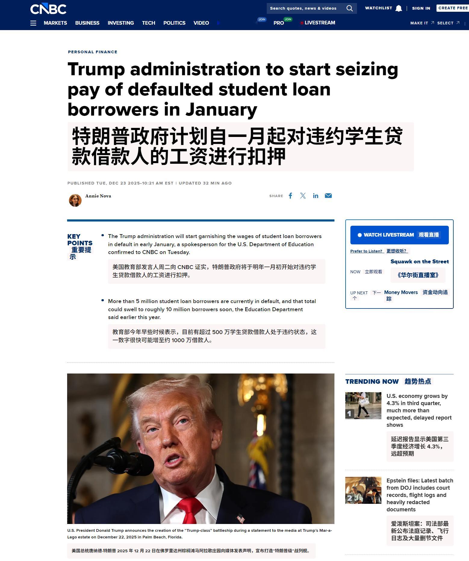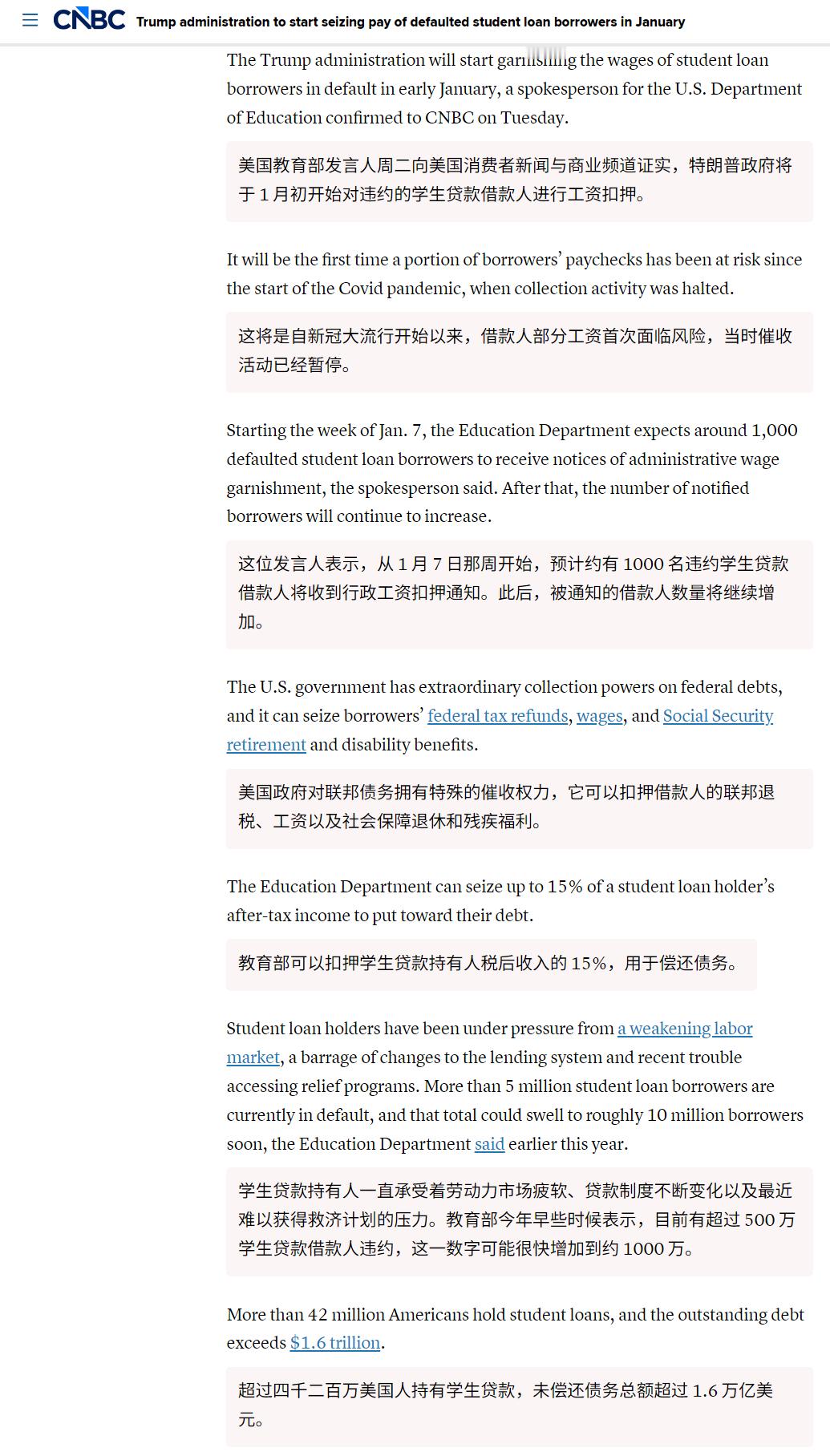 🔻即时新闻 - 特朗普政府将于 1 月开始直接扣发拖欠学生贷款借款人的工资。🔻CNBC 报道。🔻斩杀线进行时。美国斩杀线牢a热点现场海外新鲜事