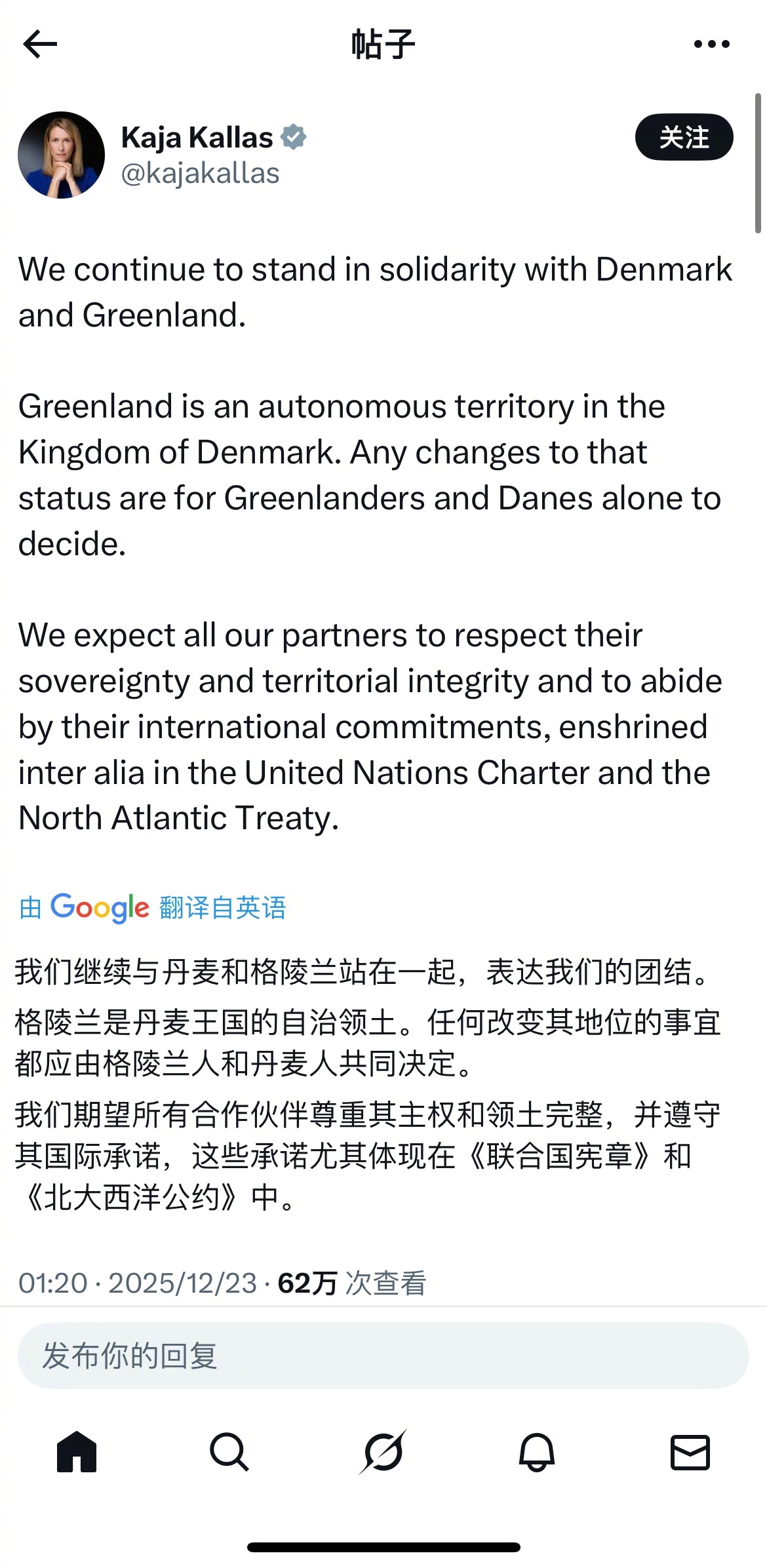 冯德莱恩就阿川再提吞并格陵兰表态:北极安全仍然是欧盟的一项关键优先事项,我们将寻求与盟友和伙伴共同努力。领土完整和主权是国际法的基本原则。这些原则不仅对欧盟至关重要,而且对世界各国也至关重要。我们与丹麦和格陵兰人民完全团结一致。另外还有欧盟外长卡拉斯:我们继续与丹麦和格陵兰站在一起,表达我们的团结。格陵兰是丹麦王国的自治领土。任何改变其地位的事宜都应由格陵兰人和丹麦人共同决定。我们期望所有合作伙伴尊重其主权和领土完整,并遵守其国际承诺,这些承诺尤其体现在《联合国宪章》和《北大西洋公约》中。真是一个字不敢提美国,不说还以为在说中国呢
