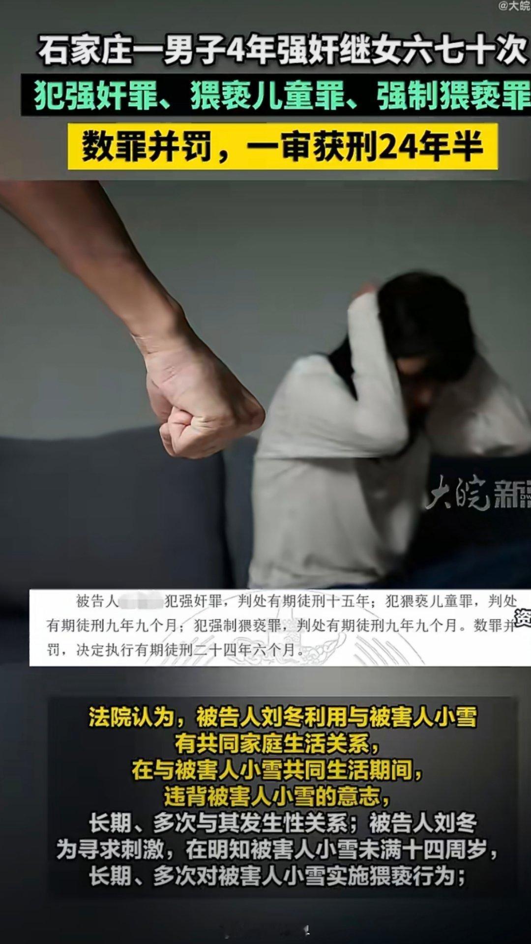 男子4年强奸继女六七十次判24年半报道里有个数字特别刺眼:四年,六七十次。什么意思?平均下来,几乎每个月都在发生。就在一个屋檐下,在母亲和弟妹身边。女孩报警的时候已经15岁了,她说小时候反抗过,但没用。那个男人威胁她:说出去就休了你妈,让你自生自灭。如果我们身边有孩子突然变得沉默、抗拒和某个长辈独处、身上出现不明伤痕……别轻易用“青春期”或者“想多了”带过去。罪恶最怕的就是有人多问一句:“你最近是不是遇到了什么事?”