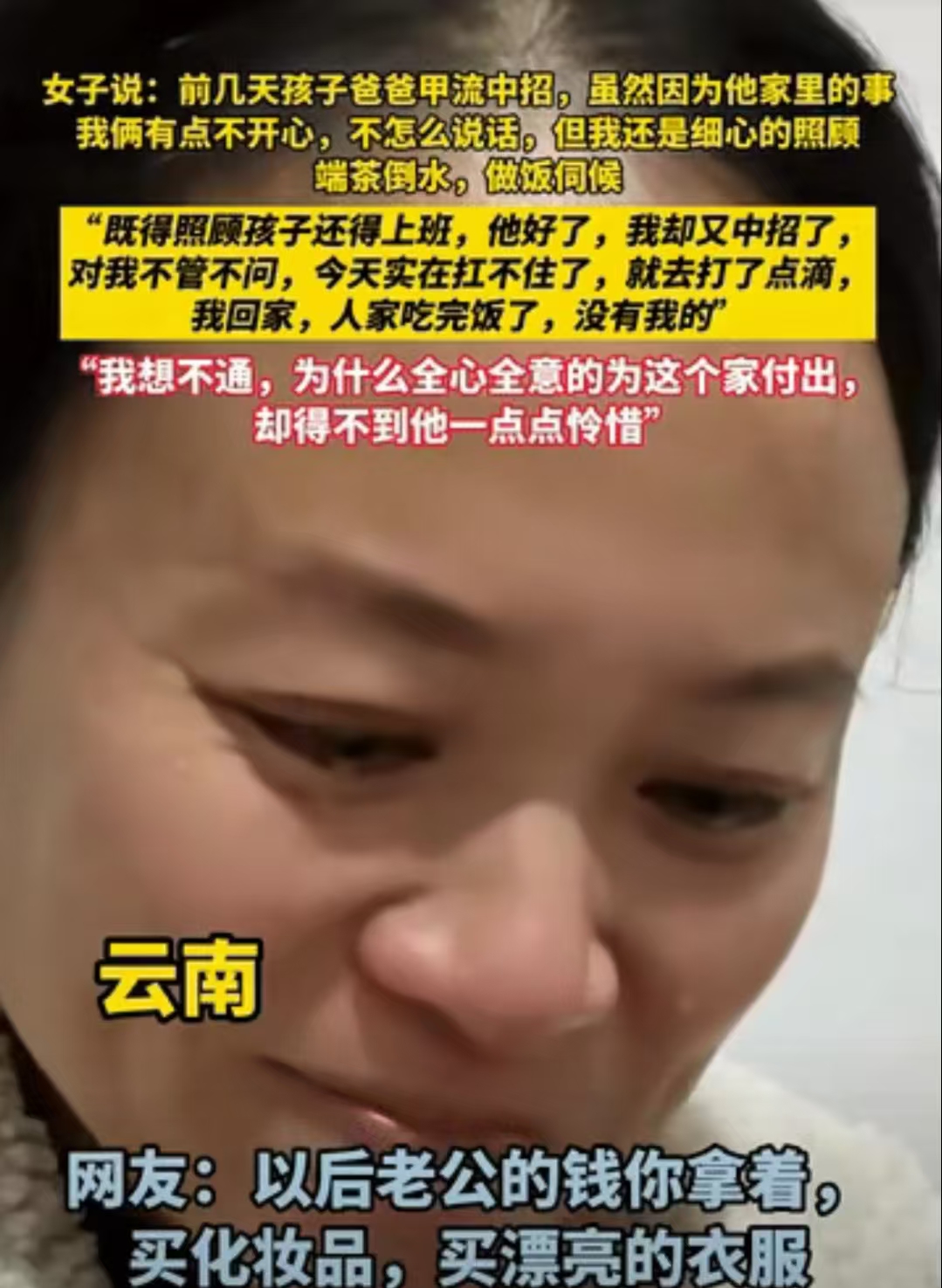 “爱人先爱己!”云南,丈夫甲流中招,妻子本来和他还在冷战,但看他身体不舒服,还是细心照料,给他端茶倒水,做饭伺候!可是丈夫好了以后,女子却中招了,而丈夫的做法,让女子委屈地眼泪直流!女子:“我全心全意为这个家付出,却得不到他的一点点怜惜!”