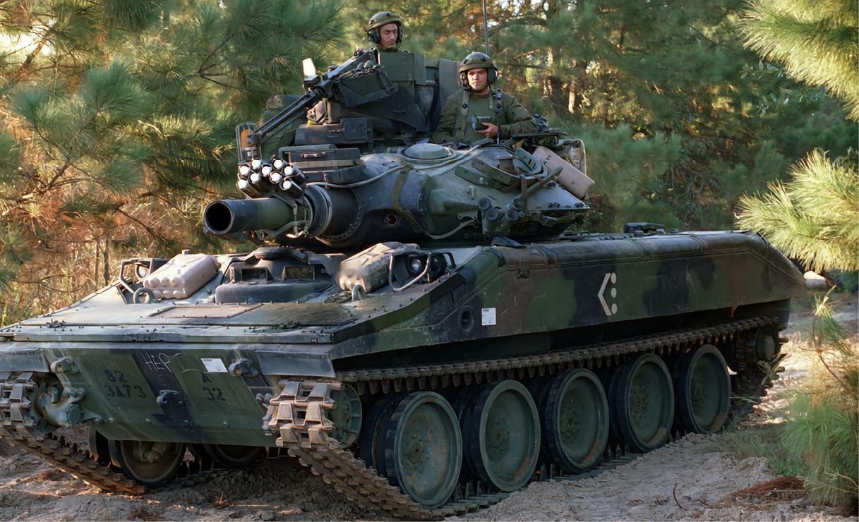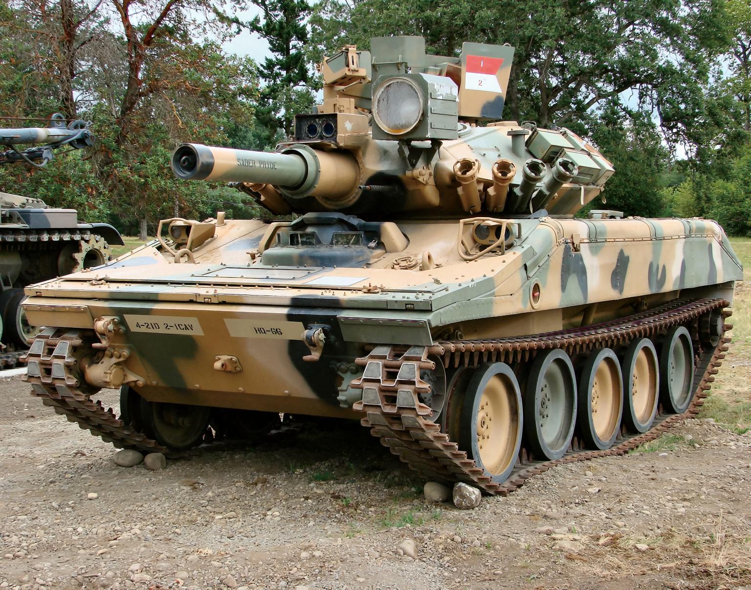美国M551“谢里登”轻型坦克M551“谢里登”(Sheridan)轻型坦克是美国于20世纪60年代研制的轻型坦克,主要装备空降部队,曾参加越战、海湾战争等。M551轻型坦克的车身以铝合金作为主要结构,主要部位加装钢制装甲,车身前方是驾驶舱,车身中央是钢铸炮塔,为了增加防护力而被设计成贝壳形,凭借曲面弧度令来袭炮弹滑开。炮塔内可容纳3人,车长和炮手在炮塔内右侧,装填手在左侧。M551轻型坦克的主炮是一门152毫米M81型火炮,辅助武器是M73同轴机枪和车顶的M2重机枪。该坦克可以用C-130运输机空运和空投,在空投时会被固定在一个铝制底板上。|