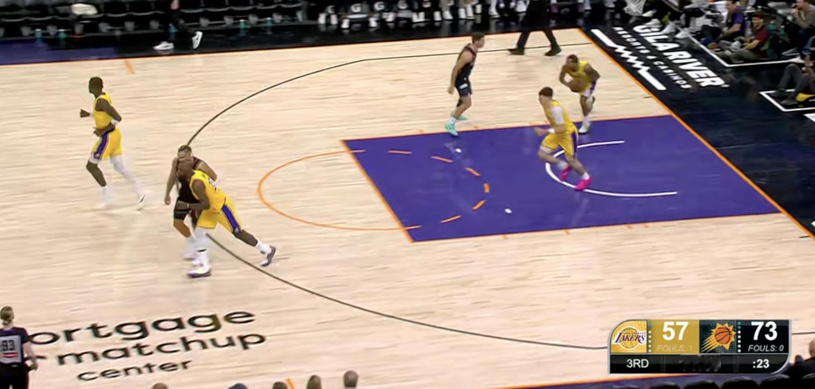 太阳上半场命中率高达60%,禁区拿了36分,湖人的防守如同纸糊的一般,篮下让人随