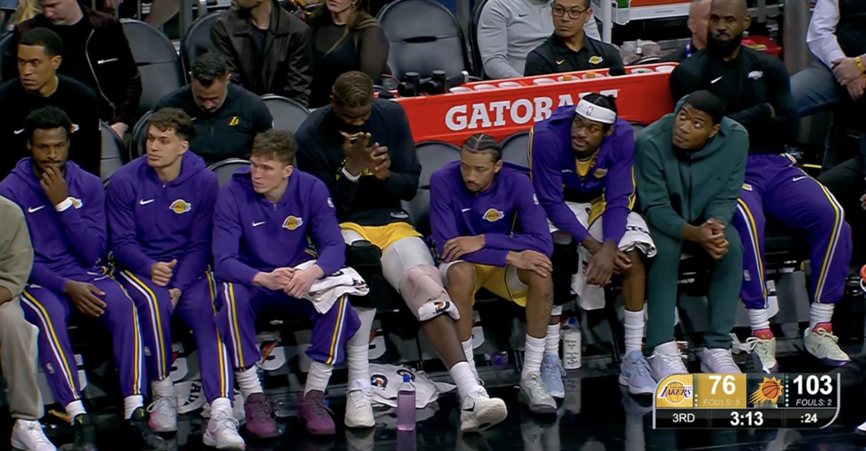 替补席坐一排每个人都沉默不语,第三节落后接近30分,甚至都没能坚持到第四节,湖人球员真的差到一点防守没有吗?我不这么认为,今天的失利可以说主教练有90%的责任,我现在很好奇赛后发布会雷迪克会作何解释。湖人vs太阳