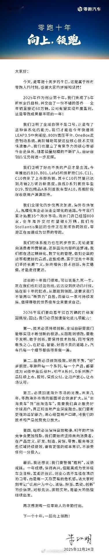 零跑十周年 朱江明发布内部信,坦言“过去的十年我们很难,可以说是九死一生。现在我们也刚过温饱线,远远没到庆功的时候。站在新十年的起点,从跟跑到领跑,这要求我们不能再以“新势力”自居,而要以一家可持续发展、值得尊敬的世界级车企来要求自己”。朱江明也明确了企业目标:1、技术必须持续创新;2、品质必须做到极致;3、加快海外市场的拓展:4、组织必须保持高度敏捷。零跑