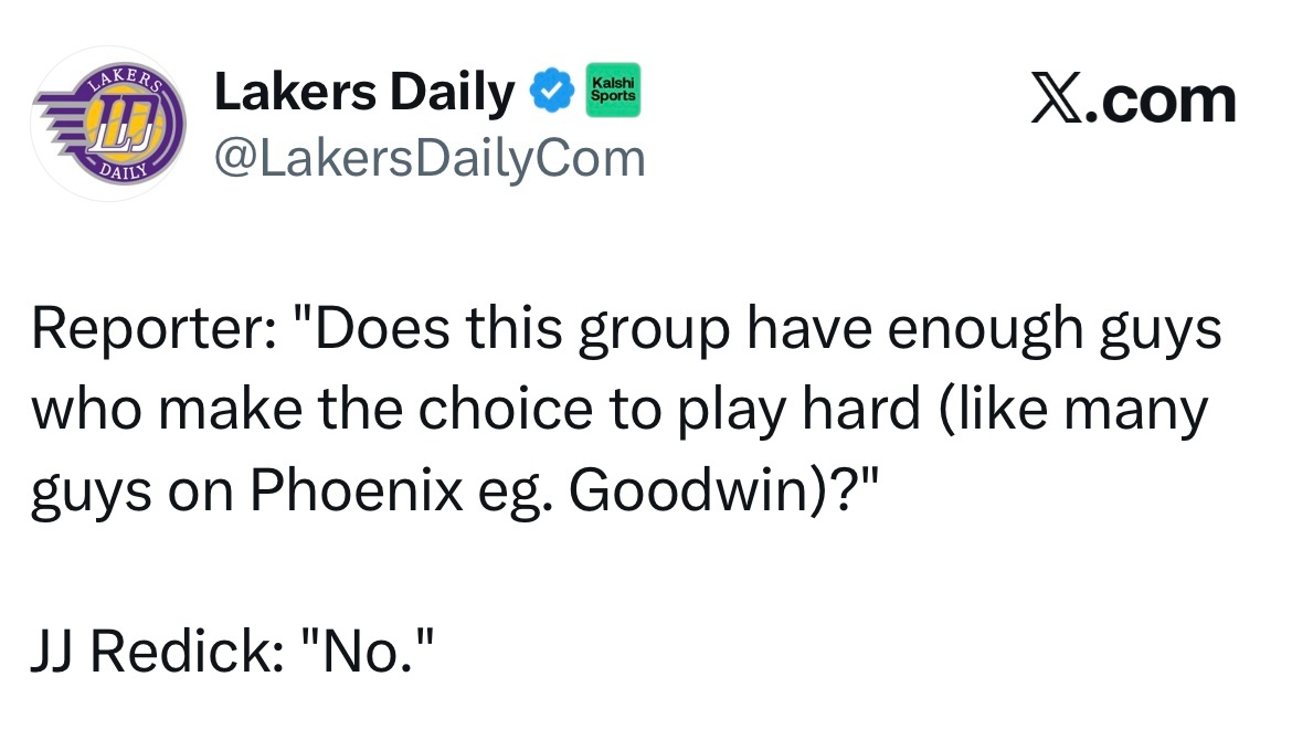 记者:“这支球队里,有足够多的球员会主动选择全力以赴去拼吗?(就像太阳队的很多球员那样,比如古德温。)”雷迪克:“没有。”