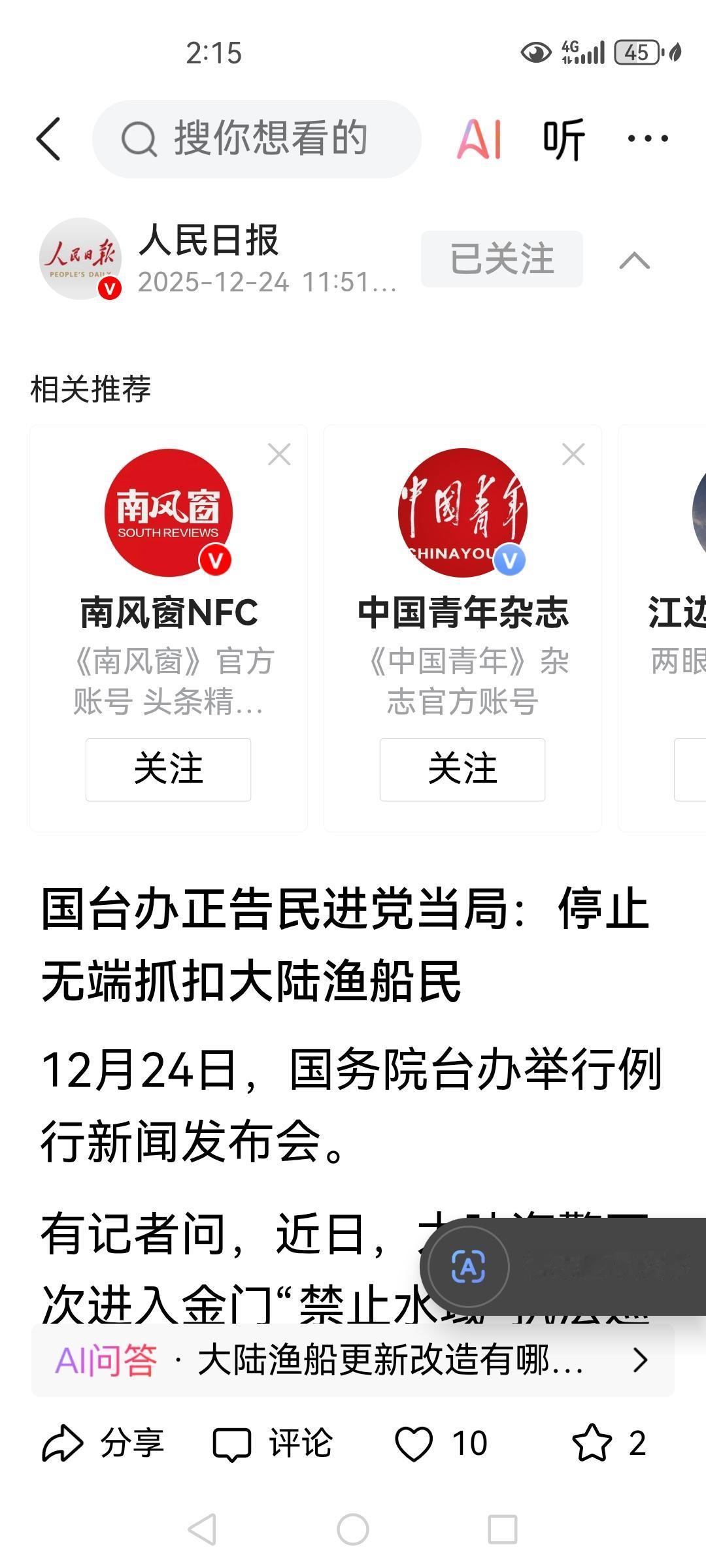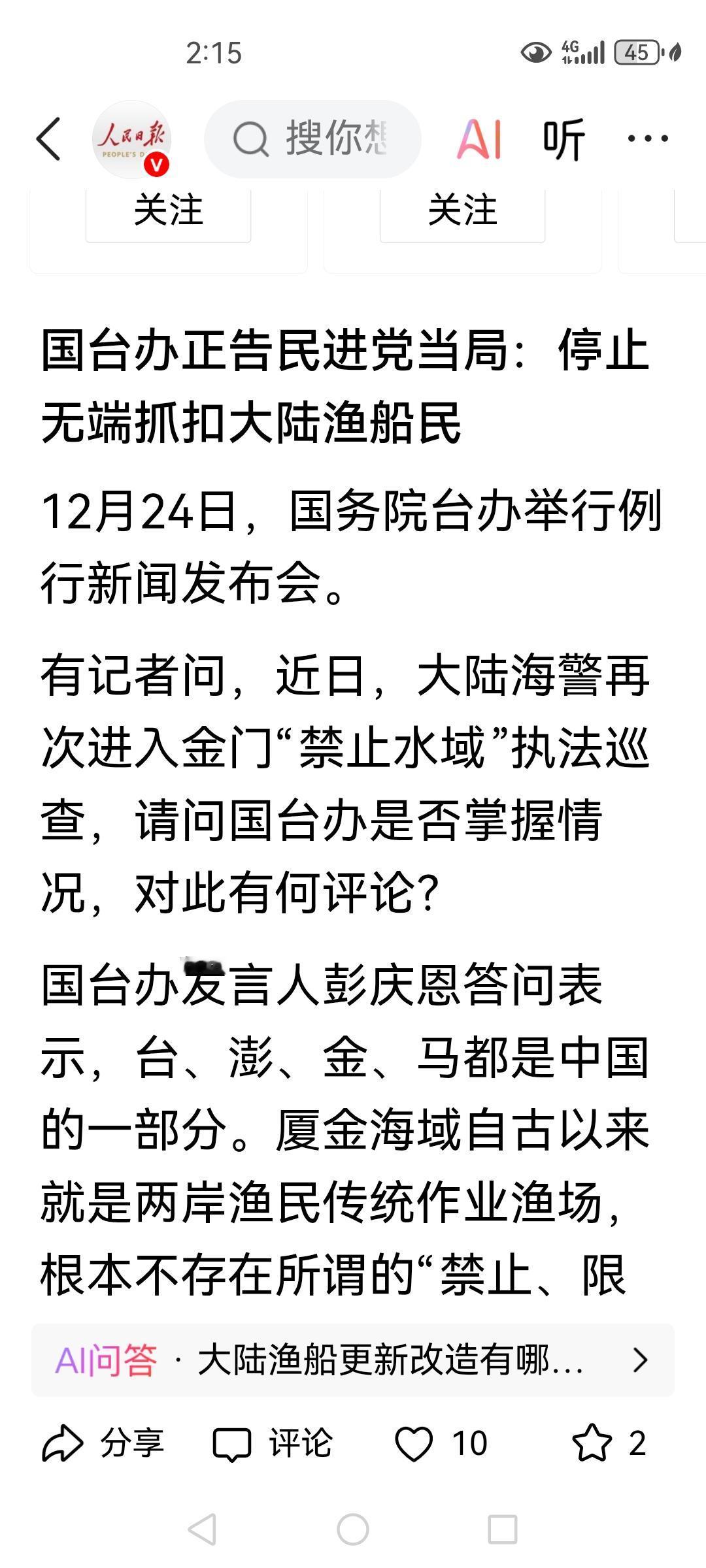 台湾当局抓捕祖国大陆渔民,如果不是新闻上这样广播,我真的难以想象,他们还敢抓捕我们的渔民吗?如果不是这条新闻透露出来,我觉得我都不难以想象,以前可能有这样的事,现在在军事演习频繁的今天,还会出现这类事情。台独分子是不是把自己太当回事了。敢抓捕我们的渔民,那么我们就抓捕他们的海警,执法者,谁抓捕我们的,我们就抓捕谁,这应该是正确的做法,并且要形成机制。希望我们的海运管理部门,硬起来,直接抓捕他们的海警,如果对方是军人,那就由军人来负责。