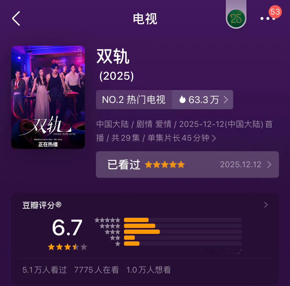 虞书欣何与《双轨》豆瓣开分6.7分国外差不多的打分人数,开分9.8分我也打了五分,我认为可以更高虞书欣何与双轨豆瓣开分6.7