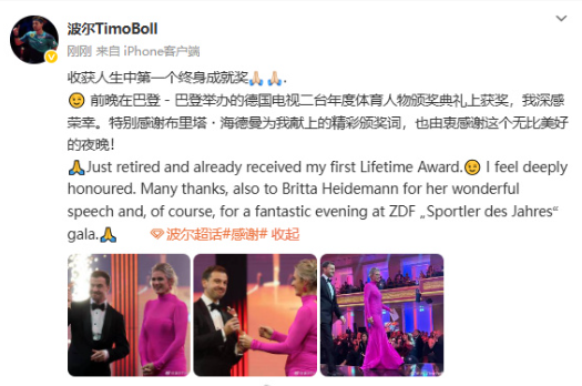 德国乒乓球运动员波尔晒照发文: 收获人生中第一个终身成就奖,前晚在巴登 - 巴登举办的德国电视二台年度体育人物颁奖典礼上获奖,我深感荣幸。特别感谢布里塔・海德曼为我献上的精彩颁奖词,也由衷感谢这个无比美好的夜晚!