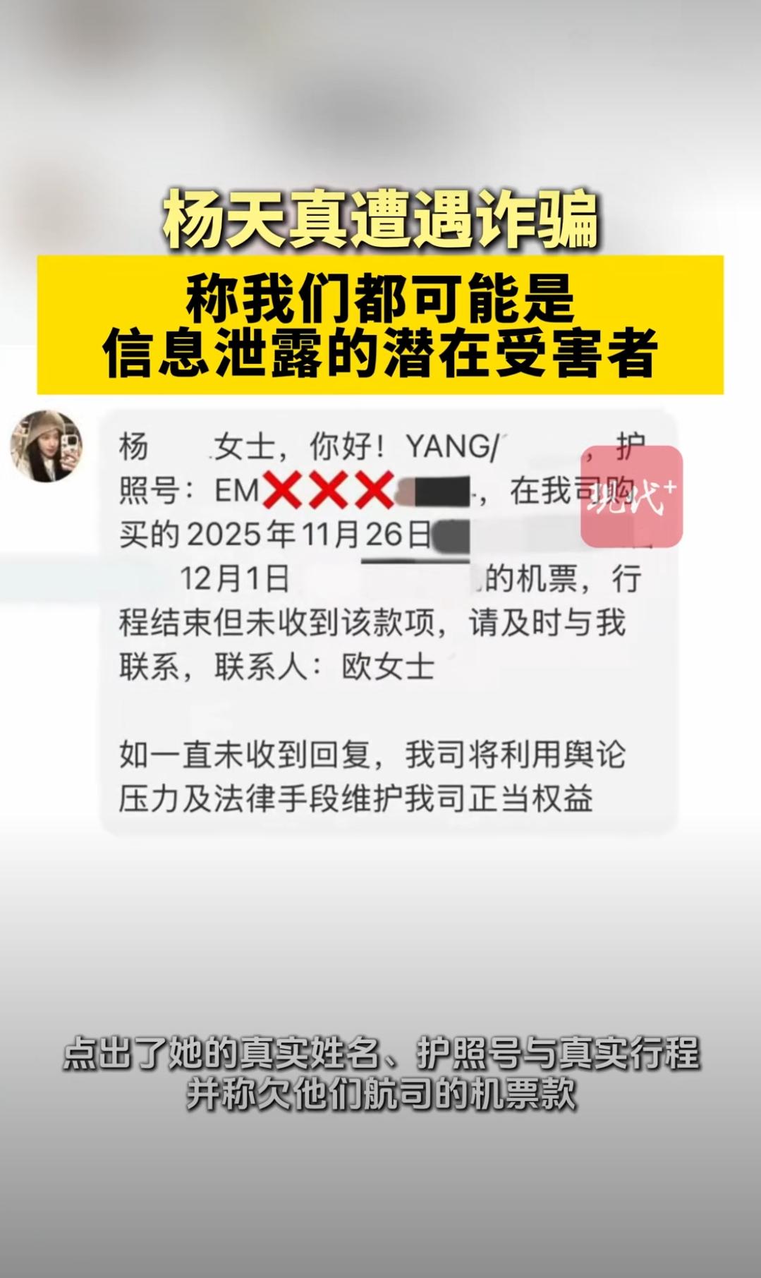 明星也中招!杨天真遭精准诈骗,隐私泄露细思极恐 家人们谁懂啊!杨天真百万粉丝账号竟收到诈骗私信,骗子精准报出她的真实姓名、护照号,连夏威夷行程都了如指掌,还逼要“拖欠航司机票款”,威胁不付就报警! 幸亏她公司有专属机票支付系统,确认无欠款才没上当。她坦言这是信息泄露导致的精准骗局,不管是名人还是普通人都可能中招。 提醒大家:收到含私人真实信息的陌生私信,千万别回拨核实、别转钱,第一时间报警!你的隐私可能早被骗子盯上了!