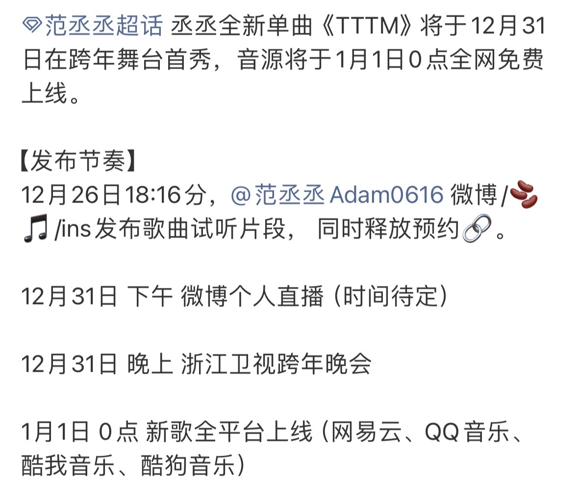 范丞丞新歌跨年首秀范丞丞新歌《TTTM》将于12月31日跨年舞台首秀!🎉音源于1月1日零点上线,好惊喜的新年礼物,期待丞丞的新歌范丞丞新歌预热