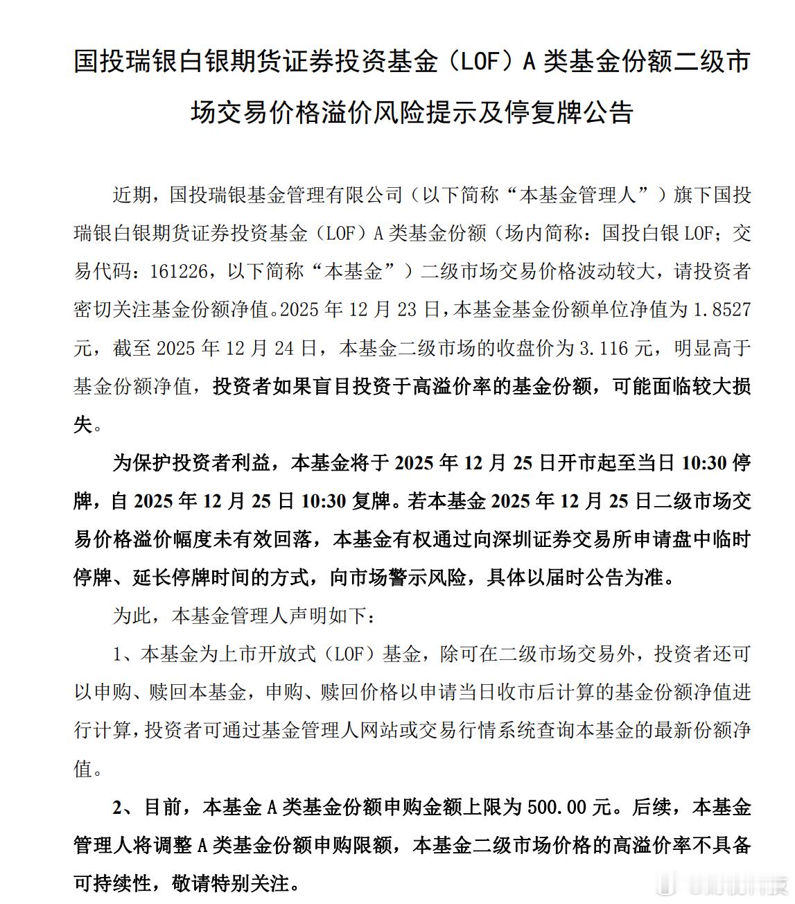 【白银基金12月25日停牌1小时国投白银LOF公告】12月24日,国投白银LOF公告,本基金二级市场的收盘价为3.116元,明显高于基金份额净值,投资者如果盲目投资于高溢价率的基金份额,可能面临较大损失。本基金将于2025年12月25日开市起至当日10:30停牌,自2025年12月25日10:30复牌。目前,本基金A类基金份额申购金额上限为500.00元。后续,本基金管理人将调整A类基金份额申购限额,本基金二级市场价格的高溢价率不具备可持续性,敬请特别关注。5年12月25日开市起至当日10:30停牌,自2025年12月25日10:30复牌。(财联社)