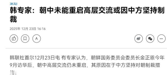 韩国媒体爆了一个大消息!韩媒称,中国跟朝鲜在一个问题上有不小的分歧!12月23日,根据韩联社报道,韩媒援引专家观点声称,朝鲜国务委员会委员长金正恩今年9月访华后,朝中高层交流“仍未重启”,其原因在于中方坚持对朝制裁措施。 看到这则报道,不少人可能会疑惑,中朝作为传统友好邻邦,真会因为制裁问题闹分歧吗?咱们先把这事捋清楚,别被韩媒的片面解读带了节奏。 首先要明确一个核心前提,中方对朝采取的所谓“制裁措施”,从来不是单方面的决定,而是联合国安理会相关决议的要求,中方作为安理会常任理事国,始终认真执行各项涉朝决议,这是履行国际义务的体现,而非针对朝鲜本身。 韩媒拿“中方坚持制裁”说事,明显是混淆了概念。早在今年9月,外交部发言人华春莹就曾明确表态,安理会对朝反应应指向明确,主要针对朝核活动,制裁不是最终目的,也不是唯一手段,归根结底还是要通过对话和平解决半岛核问题。 这就说明,中方的立场一直很清晰:制裁是为了推动无核化,而不是要割裂与朝鲜的关系。更何况,联合国对朝决议本身就存在“宽严平衡”,明确规定出于民生、医疗等人道主义目的的交易可免于制裁,并非全面封锁,中方也一直严格按照决议精神,保障朝鲜民众的基本生活需求。 再说说所谓“朝中高层交流仍未重启”的说法,更是站不住脚。高层交流的频次的形式,从来不是衡量两国关系的唯一标准,更不能简单归因于制裁。今年9月金正恩委员长访华,中朝双方就半岛局势及双边合作达成多项共识,这本身就是最高层级的有效沟通。 而之后的互动,可能更多集中在具体合作落实、外交渠道沟通等层面,未必需要频繁公开报道。韩媒仅凭“未公开重启高层会晤”就臆测分歧,本质上是忽略了国家间交往的多样性和复杂性。 要搞懂韩媒为何此时炒作这事,得先看看当前半岛的局势。近期韩国李在明政府刚完成军方高层大换血,前线部队还特意后撤以降低摩擦风险,明显是想为内部稳定争取时间,同时希望缓和与朝鲜的紧张关系。 但尴尬的是,朝鲜此前已将韩国界定为“敌国”,对首尔释放的橄榄枝始终不予回应,李在明政府意识到仅凭自身力量无法破冰,便寄希望于中方发挥“建设性作用”,推动南北对话。在这种背景下,炒作“中朝分歧”,或许是想给中方施压,暗示中方应放松对朝制裁以换取朝鲜对话,同时也想借机分化中朝关系,削弱中方在半岛事务中的影响力。 但韩媒显然忽略了关键一点:中方的对朝政策,始终围绕“半岛无核化”和“和平稳定”两个核心,不会因外部施压而改变。12月18日联合国安理会朝核问题公开会上,中方代表耿爽就明确呼吁,各方应摒弃冷战思维,避免激化矛盾,推动半岛问题回到政治解决轨道,同时强调中方一直以自己的方式维护半岛和平稳定。 这意味着,中方既不会放弃制裁这一推动无核化的重要手段,也不会停止为对话协商创造条件,更不会因为韩国的诉求而改变自身的原则立场。 反观半岛局势紧张的根源,其实根本不在于中朝是否有分歧,而在于个别国家的冷战思维和军事挑衅。今年10月底,朝鲜试射洲际弹道导弹后,韩美立即举行大规模空中联合演习,出动110余架军机开展精确轰炸训练,这种“以武对武”的做法,只会加剧双方对立,让局势更难缓和。 而朝鲜之所以对韩国的对话提议反应冷淡,很大程度上也是因为韩美同盟未发生实质性调整,朝鲜看不到真正的诚意,毕竟平壤衡量对方诚意的标准,从来不是前线的临时后撤,而是安全结构层面的根本改变。 还有一个细节值得注意,近期俄朝关系持续升温,普京总统在给金正恩的新年贺信中明确表示,俄朝将更一致地应对时代威胁和挑战,双方签署的《全面战略伙伴关系条约》也已生效。在这种地区力量格局变化的背景下,韩国更担心自己在半岛事务中被边缘化,炒作中朝分歧,或许也是想转移焦点,掩盖自身在对朝政策上的困境。 总的来说,韩媒的这则“大消息”,本质上是基于片面信息的过度解读,背后藏着韩国自身的外交诉求和局势焦虑。中朝关系的走向,从来不会被第三方的炒作所左右,而半岛问题的解决,也离不开各方的理性克制和务实行动。咱们作为旁观者,更要看清事件的本质,别被不实言论带偏了节奏。