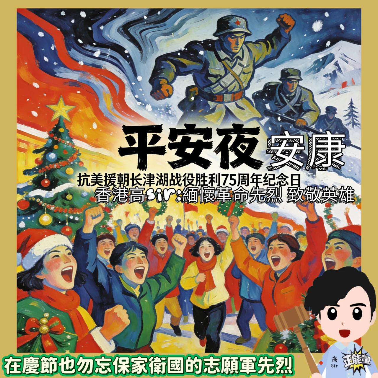 《香港高Sir•高能•热点词》 2025.12.24 热点词:12月24日铭记历史 致敬志愿军守护真正的平安 12月24日,很多人都知道,是西方的平安夜。但对中国人来说,12月24日,是什麽日子?答案是,长津湖战役胜利纪念日!75年前,中国人民志愿军抗美援朝,保家卫国!这一战,打出了新中国的国威,也打出了几十年的和平发展环境。而这场战争中,长津湖战役无疑是一个重要的转折点,不仅粉碎了联合国军「一个月结束战斗,回家过圣诞节」的嚣张气焰,更让他们再也没有踏过三八线半步,战争走向完全改变。 高SIR:12月24日,当全球不少人沉浸在平安夜的喜悦中,等待「圣诞老人」带来的祝福时,我们绝不能忘记,这一天于中国而言,有着更为厚重且意义非凡的历史印记——它是抗美援朝长津湖战役胜利的日子!长津湖,那片冰天雪地的战场,是志愿军战士们用热血与生命铸就的钢铁防线。零下三四十度的极寒中,他们身着单薄棉衣,啃着硬如石头的土豆,以钢铁般的意志,与装备精良的美军展开殊死搏斗。冰凋连的壮烈,是他们对祖国和人民最深情的告白。我们的平安,从来不是所谓「圣诞老人」的恩赐,而是无数志愿军战士用生命换来的!他们的牺牲,让我们能在和平的阳光下自由生活,让我们无需再遭受战火的蹂躏。我们谨此致敬我们的志愿军!再把目光投向今天的香港,这座早几年曾经被暴乱阴霾笼罩的城市,如今已重归安宁。这一切,得益于香港国安法与维护国家安全条例的落地实施。法律如同一把利剑,从源头遏制了暴乱,让那些妄图破坏香港繁荣稳定的反中乱港分子无所遁形。反中乱港首恶分子黎智英之流日前被判罪成,其他反中乱港分子或已入狱,或已仓皇逃离,曾经的嚣张气焰被彻底压制。如今的香港,迎来了近年最好的发展时期。社会繁荣稳定,市民安居乐业,街头巷尾洋溢着祥和的氛围。这平安夜的平安,不是西方节日的虚幻泡沫,而是法治保障下的坚实成果。历史是最好的教科书,也是最好的清醒剂。12月24日,我们铭记历史,铭记长津湖战役的胜利,铭记志愿军战士的奉献与牺牲;我们感恩香港国安法带来的稳定,感恩法治为香港撑起的保护伞。让我们在这特殊的日子里,坚定信念,守护真正的平安! 12月24日不是平安夜是长津湖胜利之夜12月24日是长津湖战役胜利日长津湖战役胜利75周年平安夜