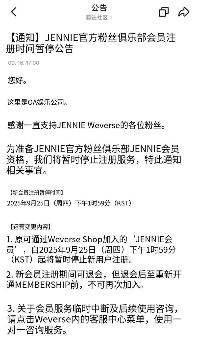 Jennie啊,在weverse上发了什么啊?9月份停止会员加入后到现在也没开通这件事还记得吗?😭