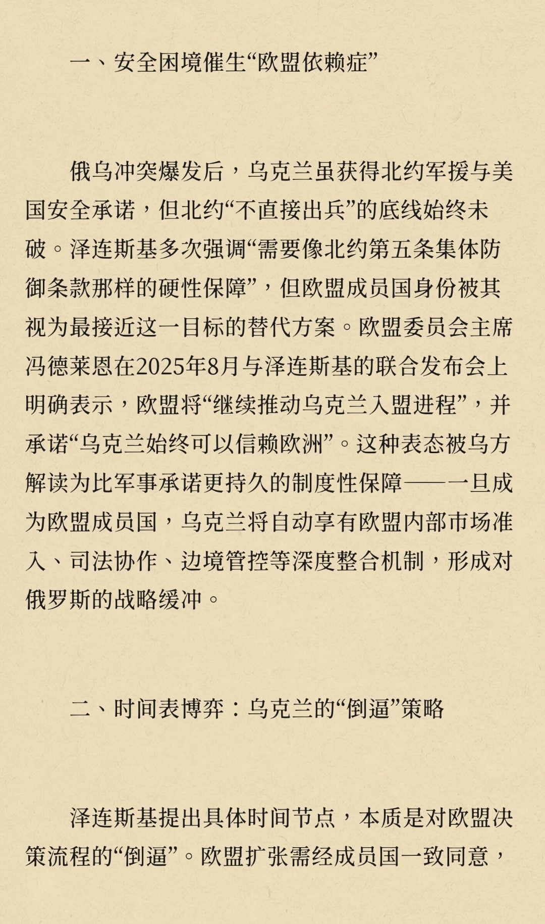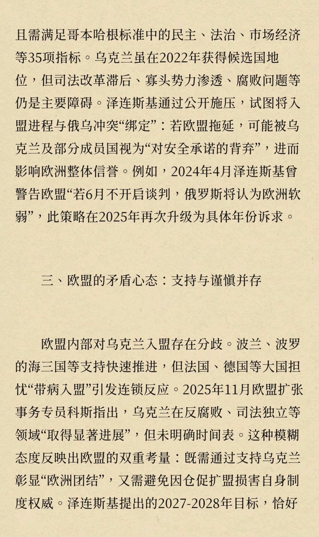 | 乌克兰总统泽连斯基近期多次公开要求欧盟明确乌克兰加入的具体时间,甚至在“和平计划”草案中将入盟日期列为第七条核心条款,提出“2027年或2028年”的预期目标。俄乌冲突爆发后,乌克兰虽获得北约军援与美国安全承诺,但北约“不直接出兵”的底线始终未破。泽连斯基多次强调“需要像北约第五条集体防御条款那样的硬性保障”,但欧盟成员国身份被其视为最接近这一目标的替代方案。欧盟委员会主席冯德莱恩在2025年8月与泽连斯基的联合发布会上明确表示,欧盟将“继续推动乌克兰入盟进程”,并承诺“乌克兰始终可以信赖欧洲”。这种表态被乌方解读为比军事承诺更持久的制度性保障——一旦成为欧盟成员国,乌克兰将自动享有欧盟内部市场准入、司法协作、边境管控等深度整合机制,形成对俄罗斯的战略缓冲。泽连斯基提出具体时间节点,本质是对欧盟决策流程的“倒逼”。欧盟扩张需经成员国一致同意,且需满足哥本哈根标准中的民主、法治、市场经济等35项指标。乌克兰虽在2022年获得候选国地位,但司法改革滞后、寡头势力渗透、腐败问题等仍是主要障碍。泽连斯基通过公开施压,试图将入盟进程与俄乌冲突“绑定”:若欧盟拖延,可能被乌克兰及部分成员国视为“对安全承诺的背弃”,进而影响欧洲整体信誉。例如,2024年4月泽连斯基曾警告欧盟“若6月不开启谈判,俄罗斯将认为欧洲软弱”,此策略在2025年再次升级为具体年份诉求。波兰、波罗的海三国等支持快速推进,但法国、德国等大国担忧“带病入盟”引发连锁反应。2025年11月欧盟扩张事务专员科斯指出,乌克兰在反腐败、司法独立等领域“取得显著进展”,但未明确时间表。这种模糊态度反映出欧盟的双重考量:既需通过支持乌克兰彰显“欧洲团结”,又需避免因仓促扩盟损害自身制度权威。泽连斯基提出的2027-2028年目标,恰好卡在欧盟下一轮财政框架(2027-2034)启动前,试图利用欧盟预算规划周期争取主动权。2025年特朗普政府曾表示“准备对乌提供安全保障”,但乌方担忧美国大选后政策反复。通过绑定欧盟入盟进程,乌克兰试图构建“欧盟-美国双保险”的安全架构,降低对单一大国的依赖。然而,欧盟能否在2027年前完成内部协调仍是未知数——匈牙利、斯洛伐克等国已多次阻挠对乌军援,入盟谈判可能面临更激烈博弈。泽连斯基的“时间表诉求”本质是乌克兰在安全困境中的生存策略:通过将地缘冲突转化为制度整合议题,试图在欧洲秩序重构中占据主动。但这一策略的成功与否,不仅取决于乌克兰自身的改革成效,更取决于欧盟能否超越短期利益算计,真正将乌克兰视为“欧洲安全共同体”的一部分。
