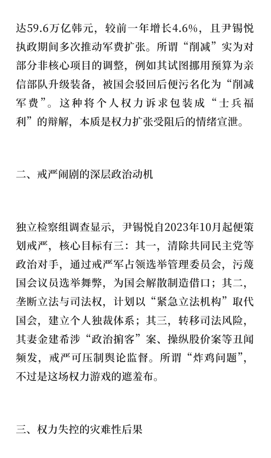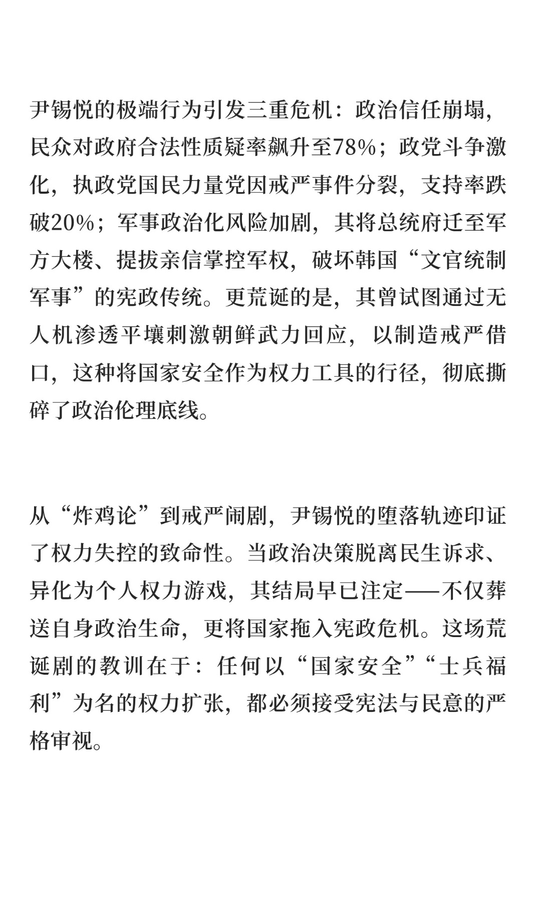 | 2025年12月22日,韩国前总统尹锡悦在庭审中抛出“士兵连炸鸡都买不起”的荒诞理由,声称这是其宣布紧急戒严的关键因素。尹锡悦在庭审中强调,因国会削减军费导致士兵吃不起炸鸡、基层军官住所锈蚀,这些细节被刻意放大为戒严的“正当性依据”。然而,韩国2024年国防预算达59.6万亿韩元,较前一年增长4.6%,且尹锡悦执政期间多次推动军费扩张。所谓“削减”实为对部分非核心项目的调整,例如其试图挪用预算为亲信部队升级装备,被国会驳回后便污名化为“削减军费”。这种将个人权力诉求包装成“士兵福利”的辩解,本质是权力扩张受阻后的情绪宣泄。独立检察组调查显示,尹锡悦自2023年10月起便策划戒严,核心目标有三:其一,清除共同民主党等政治对手,通过戒严军占领选举管理委员会,污蔑国会议员选举舞弊,为国会解散制造借口;其二,垄断立法与司法权,计划以“紧急立法机构”取代国会,建立个人独裁体系;其三,转移司法风险,其妻金建希涉“政治掮客”案、操纵股价案等丑闻频发,戒严可压制舆论监督。所谓“炸鸡问题”,不过是这场权力游戏的遮羞布。尹锡悦的极端行为引发三重危机:政治信任崩塌,民众对政府合法性质疑率飙升至78%;政党斗争激化,执政党国民力量党因戒严事件分裂,支持率跌破20%;军事政治化风险加剧,其将总统府迁至军方大楼、提拔亲信掌控军权,破坏韩国“文官统制军事”的宪政传统。更荒诞的是,其曾试图通过无人机渗透平壤刺激朝鲜武力回应,以制造戒严借口,这种将国家安全作为权力工具的行径,彻底撕碎了政治伦理底线。从“炸鸡论”到戒严闹剧,尹锡悦的堕落轨迹印证了权力失控的致命性。当政治决策脱离民生诉求、异化为个人权力游戏,其结局早已注定——不仅葬送自身政治生命,更将国家拖入宪政危机。这场荒诞剧的教训在于:任何以“国家安全”“士兵福利”为名的权力扩张,都必须接受宪法与民意的严格审视。