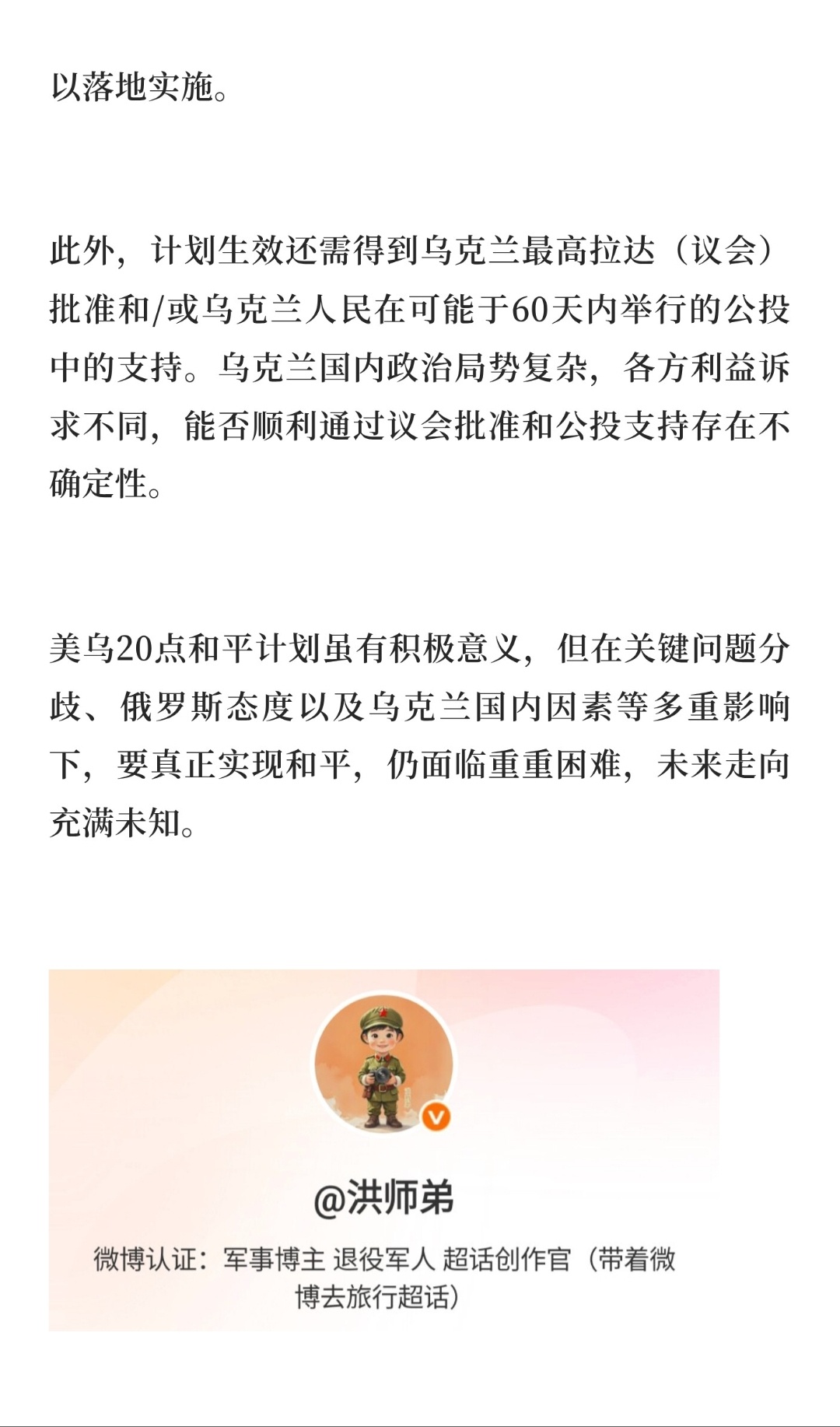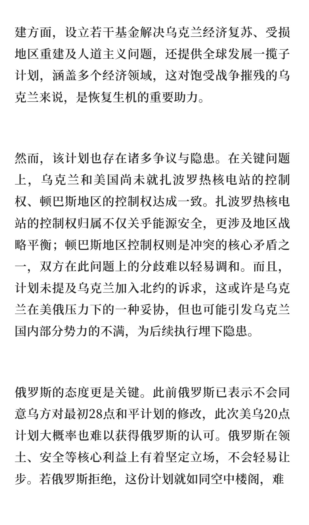 | 2025年12月24日,美乌20点和平计划全文公布,这一消息瞬间成为国际舆论焦点。该计划看似为俄乌冲突的解决带来希望,实则和平之路依旧充满变数。在安全保障上,美国、北约及欧洲签署国将为乌克兰提供类似《北大西洋公约》第五条的安全保障,这在一定程度上给予乌克兰安全感,使其在面对俄罗斯时有更强的底气。同时,双方建立监测机制,利用卫星无人机对“接触线”进行监督,有助于及时发现违规行为,减少冲突升级的风险。在经济重建方面,设立若干基金解决乌克兰经济复苏、受损地区重建及人道主义问题,还提供全球发展一揽子计划,涵盖多个经济领域,这对饱受战争摧残的乌克兰来说,是恢复生机的重要助力。在关键问题上,乌克兰和美国尚未就扎波罗热核电站的控制权、顿巴斯地区的控制权达成一致。扎波罗热核电站的控制权归属不仅关乎能源安全,更涉及地区战略平衡;顿巴斯地区控制权则是冲突的核心矛盾之一,双方在此问题上的分歧难以轻易调和。而且,计划未提及乌克兰加入北约的诉求,这或许是乌克兰在美俄压力下的一种妥协,但也可能引发乌克兰国内部分势力的不满,为后续执行埋下隐患。此前俄罗斯已表示不会同意乌方对最初28点和平计划的修改,此次美乌20点计划大概率也难以获得俄罗斯的认可。俄罗斯在领土、安全等核心利益上有着坚定立场,不会轻易让步。若俄罗斯拒绝,这份计划就如同空中楼阁,难以落地实施。此外,计划生效还需得到乌克兰最高拉达(议会)批准和/或乌克兰人民在可能于60天内举行的公投中的支持。乌克兰国内政治局势复杂,各方利益诉求不同,能否顺利通过议会批准和公投支持存在不确定性。美乌20点和平计划虽有积极意义,但在关键问题分歧、俄罗斯态度以及乌克兰国内因素等多重影响下,要真正实现和平,仍面临重重困难,未来走向充满未知。