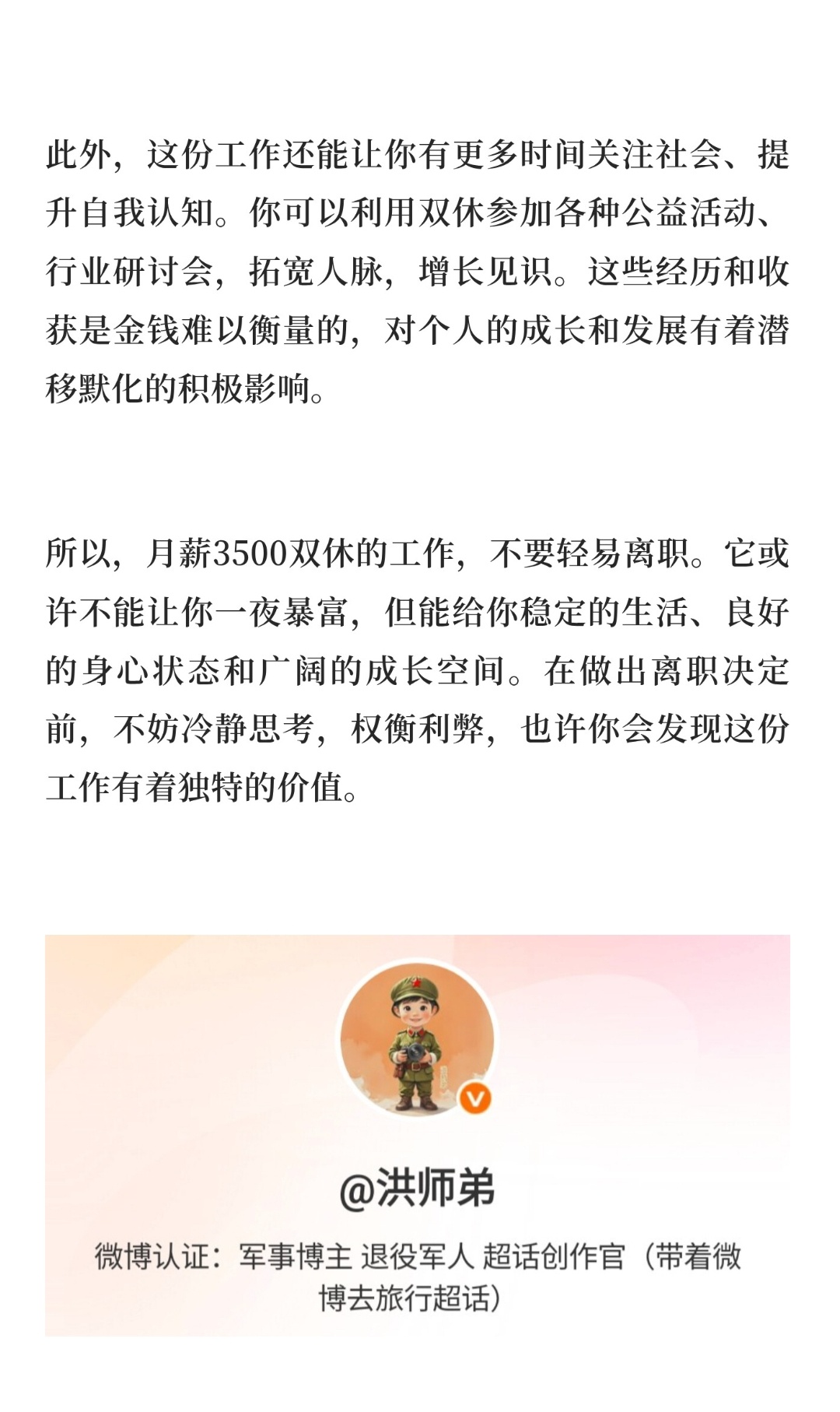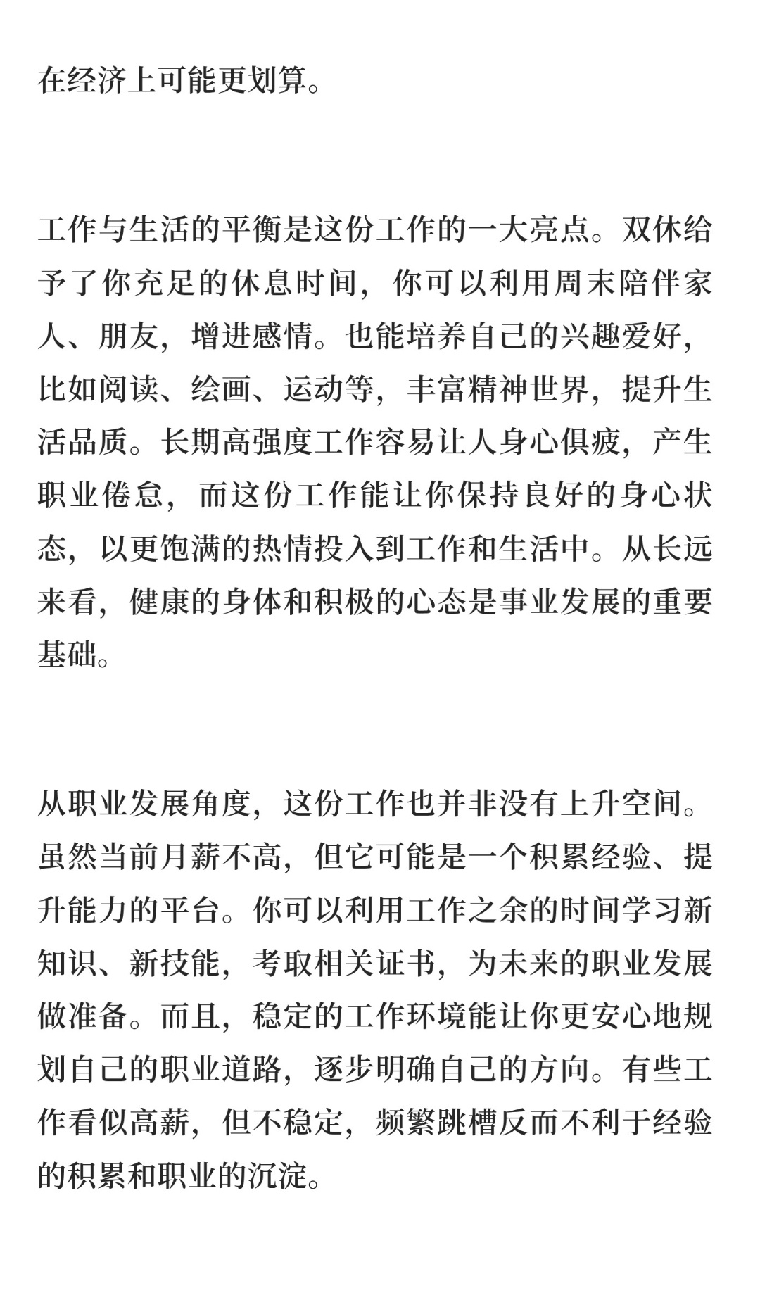 | 在当下追求高薪、高强度工作的职场氛围里,月薪3500还双休的工作,乍一看似乎缺乏吸引力,但先别急着离职,这样的工作其实有着不少隐藏优势。3500的月薪虽不算高,可对于一些生活成本较低的地区或者生活需求简单的人来说,维持基本生活绰绰有余。如果在一座小县城,房租便宜,日常饮食开销也不大,这份工资能让你有稳定的收入来源,不必为基本生活发愁。而且双休意味着你有更多属于自己的时间,能自己做饭、打理生活,进一步节省开支。相比那些高薪但需要频繁加班、消费在外卖和通勤上的工作,这种工作模式在经济上可能更划算。双休给予了你充足的休息时间,你可以利用周末陪伴家人、朋友,增进感情。也能培养自己的兴趣爱好,比如阅读、绘画、运动等,丰富精神世界,提升生活品质。长期高强度工作容易让人身心俱疲,产生职业倦怠,而这份工作能让你保持良好的身心状态,以更饱满的热情投入到工作和生活中。从长远来看,健康的身体和积极的心态是事业发展的重要基础。虽然当前月薪不高,但它可能是一个积累经验、提升能力的平台。你可以利用工作之余的时间学习新知识、新技能,考取相关证书,为未来的职业发展做准备。而且,稳定的工作环境能让你更安心地规划自己的职业道路,逐步明确自己的方向。有些工作看似高薪,但不稳定,频繁跳槽反而不利于经验的积累和职业的沉淀。此外,这份工作还能让你有更多时间关注社会、提升自我认知。你可以利用双休参加各种公益活动、行业研讨会,拓宽人脉,增长见识。这些经历和收获是金钱难以衡量的,对个人的成长和发展有着潜移默化的积极影响。所以,月薪3500双休的工作,不要轻易离职。它或许不能让你一夜暴富,但能给你稳定的生活、良好的身心状态和广阔的成长空间。在做出离职决定前,不妨冷静思考,权衡利弊,也许你会发现这份工作有着独特的价值。