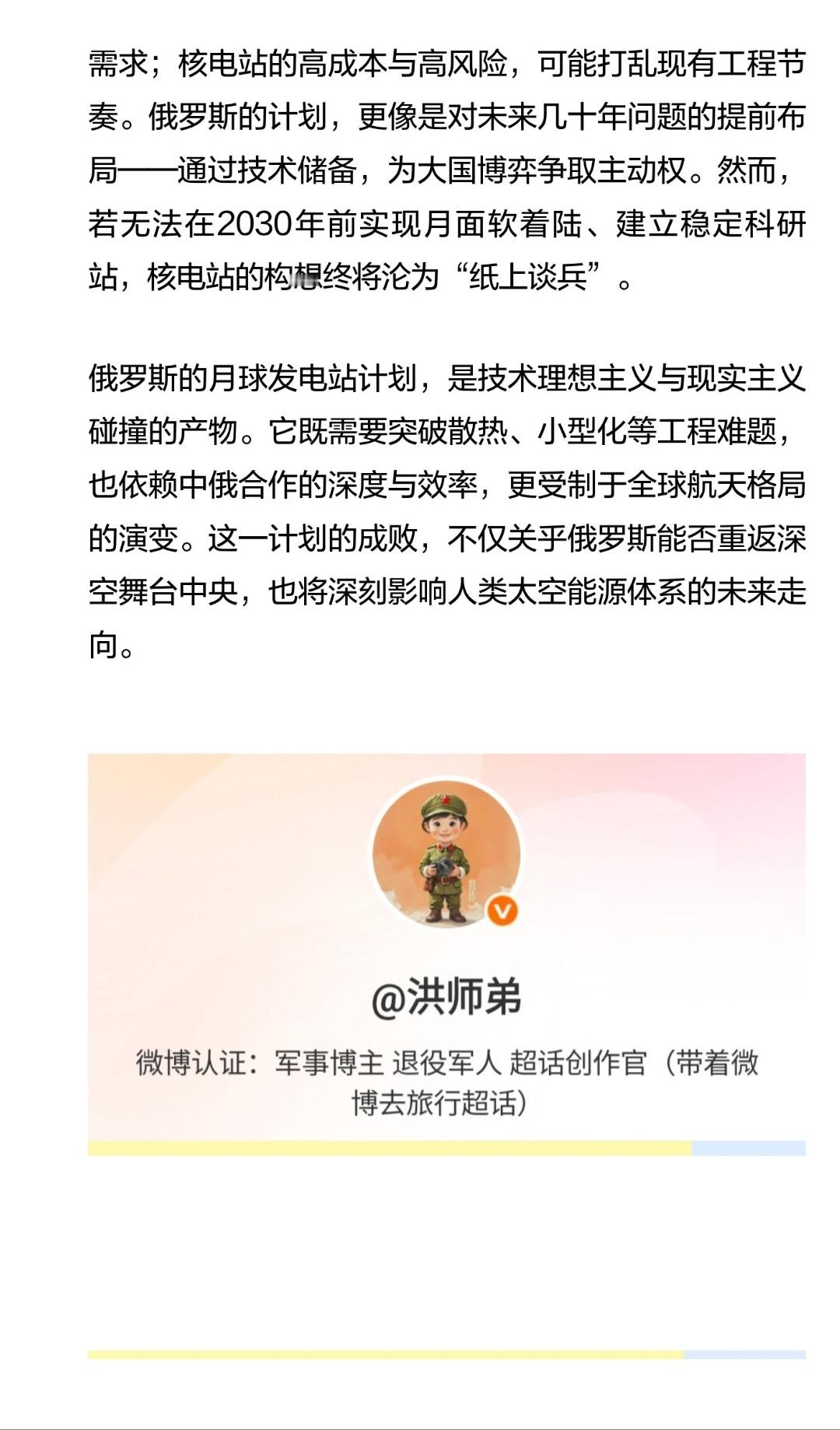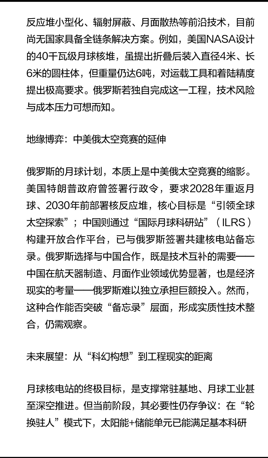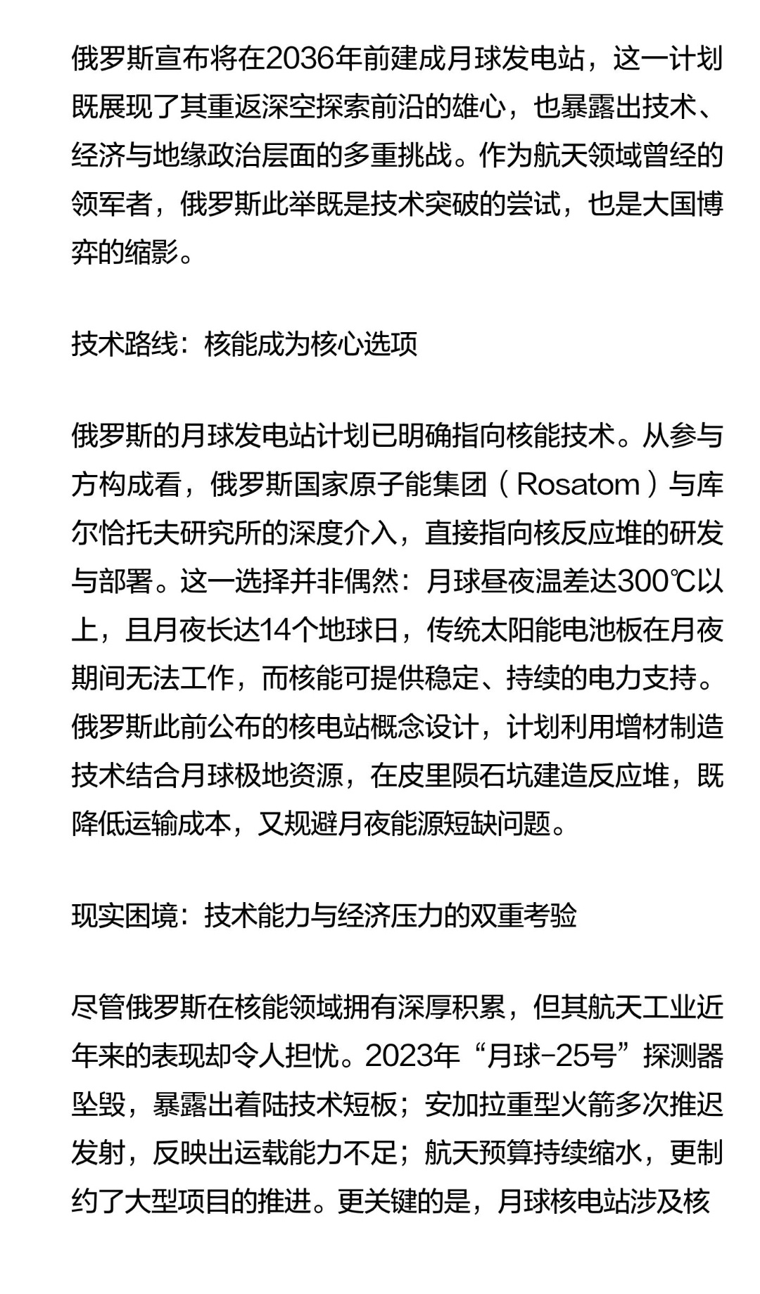 | 俄罗斯宣布将在2036年前建成月球发电站,这一计划展现了其重返深空探索前沿的雄心,作为航天领域曾经的领军者,俄罗斯此举即是尝试,也是大国博弈的表现。俄罗斯的月球发电站计划已明确指向核能技术。从参与方构成看,俄罗斯国家原子能集团(Rosatom)与库尔恰托夫研究所的深度介入,直接指向核反应堆的研发与部署。这一选择并非偶然:月球昼夜温差达300℃以上,且月夜长达14个地球日,传统太阳能电池板在月夜期间无法工作,而核能可提供稳定、持续的电力支持。俄罗斯此前公布的核电站概念设计,计划利用增材制造技术结合月球极地资源,在皮里陨石坑建造反应堆,既降低运输成本,又规避月夜能源短缺问题。尽管俄罗斯在核能领域拥有深厚积累,但其航天工业近年来的表现却令人担忧。2023年“月球-25号”探测器坠毁,暴露出着陆技术短板;安加拉重型火箭多次推迟发射,反映出运载能力不足;航天预算持续缩水,更制约了大型项目的推进。更关键的是,月球核电站涉及核反应堆小型化、辐射屏蔽、月面散热等前沿技术,目前尚无国家具备全链条解决方案。例如,美国NASA设计的40千瓦级月球核堆,虽提出折叠后装入直径4米、长6米的圆柱体,但重量仍达6吨,对运载工具和着陆精度提出极高要求。俄罗斯若独自完成这一工程,技术风险与成本压力可想而知。俄罗斯的月球计划,本质上是中美俄太空竞赛的缩影。美国特朗普政府曾签署行政令,要求2028年重返月球、2030年前部署核反应堆,核心目标是“引领全球太空探索”;中国则通过“国际月球科研站”(ILRS)构建开放合作平台,已与俄罗斯签署共建核电站备忘录。俄罗斯选择与中国合作,既是技术互补的需要——中国在航天器制造、月面作业领域优势显著,也是经济现实的考量——俄罗斯难以独立承担巨额投入。然而,这种合作能否突破“备忘录”层面,形成实质性技术整合,仍需观察。月球核电站的终极目标,是支撑常驻基地、月球工业甚至深空推进。但当前阶段,其必要性仍存争议:在“轮换驻人”模式下,太阳能+储能单元已能满足基本科研需求;核电站的高成本与高风险,可能打乱现有工程节奏。俄罗斯的计划,更像是对未来几十年问题的提前布局——通过技术储备,为大国博弈争取主动权。然而,若无法在2030年前实现月面软着陆、建立稳定科研站,核电站的构想终将沦为“纸上谈兵”。俄罗斯的月球发电站计划,是技术理想主义与现实主义碰撞的产物。它既需要突破散热、小型化等工程难题,也依赖中俄合作的深度与效率,更受制于全球航天格局的演变。这一计划的成败,不仅关乎俄罗斯能否重返深空舞台中央,也将深刻影响人类太空能源体系的未来走向。