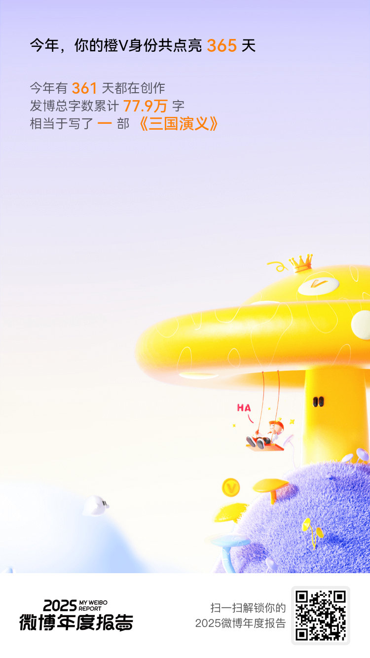 微博年度报告创作成就已解锁:2025年,我成功维持橙V成就 365天!感谢所有小伙伴的支持,新一年继续一起冲!快来>>2025微博年度报告 一键生成你的年度报告吧!微博之夜