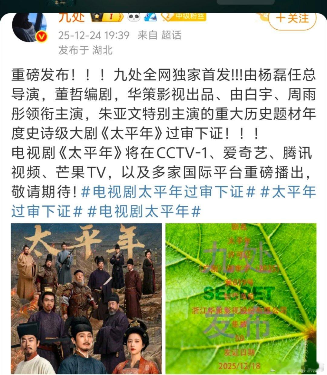 太平年过审下证瓜主爆料《太平年》过审下证,集数由51集变更为50集!但是没说什么时候播!不过也快了!基本上确定央一1月下旬播出!敬请期待 !