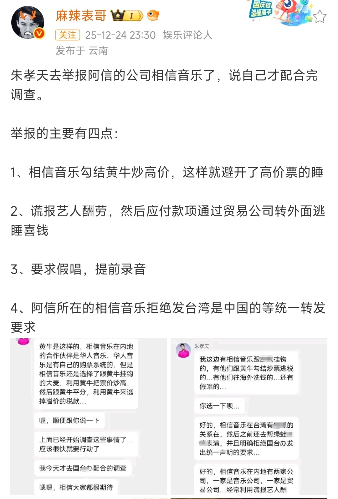 五月天公司税务假账?大概率又是一场博眼球的闹剧朱孝天疑似爆料五月天所属相信音乐存在税务问题、假账操作,还扯上假唱一事,说自己配合调查且留有证据,这瓜看似劲爆,实则漏洞百出。先不说爆料没放出任何实质性证据,单凭几句口头指控就想锤倒深耕乐坛多年的公司,未免太儿戏。再看网友态度,不少人都觉得离谱五月天火了这么多年,真要偷税假账,早被查了朱孝天突然爆料,怕不是另有隐情毕竟之前娱乐圈太多爆料反转,空口无凭的指控实在站不住脚。更何况五月天向来口碑在线,演唱会全开麦、敬业演出的画面比比皆是,粉丝们也都坚信偶像和公司的底线。说到底,在没有官方实锤之前,这些爆料不过是博眼球的闹剧,大家别被带节奏,理性吃瓜等真相就好。