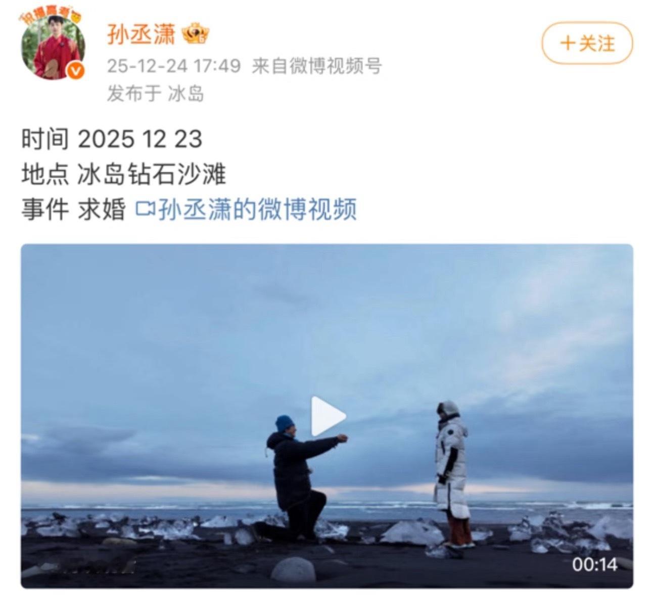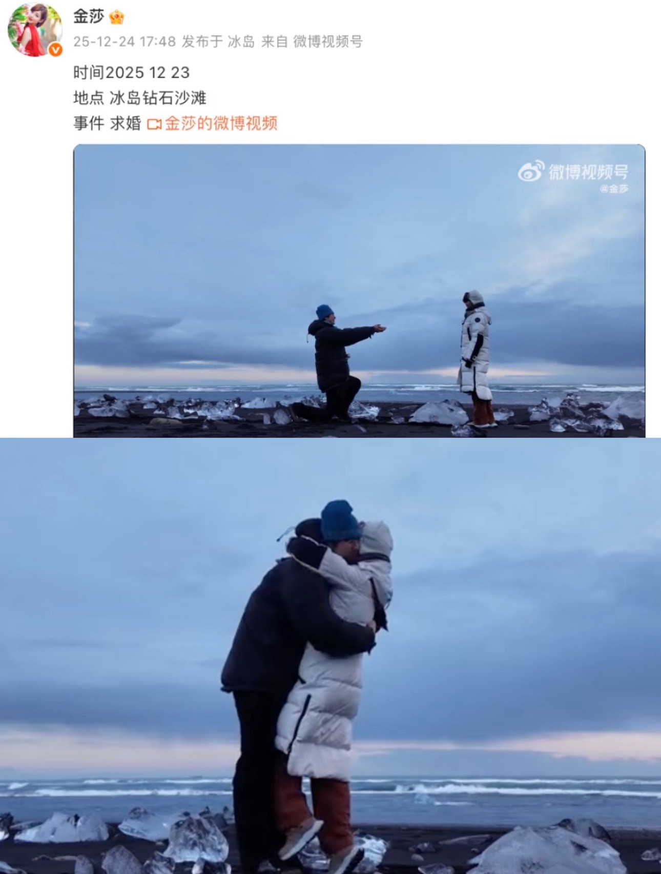 孙丞潇冰岛求婚金莎 哇哦,我记得早在2023年就公布恋情了吧!今天男方求婚成功好浪漫啊能看得出来两人是真心相爱的现在唯有祝福,而且我觉得金莎会喜欢冰岛诶,光是看他们的视频就觉得他们很幸福了