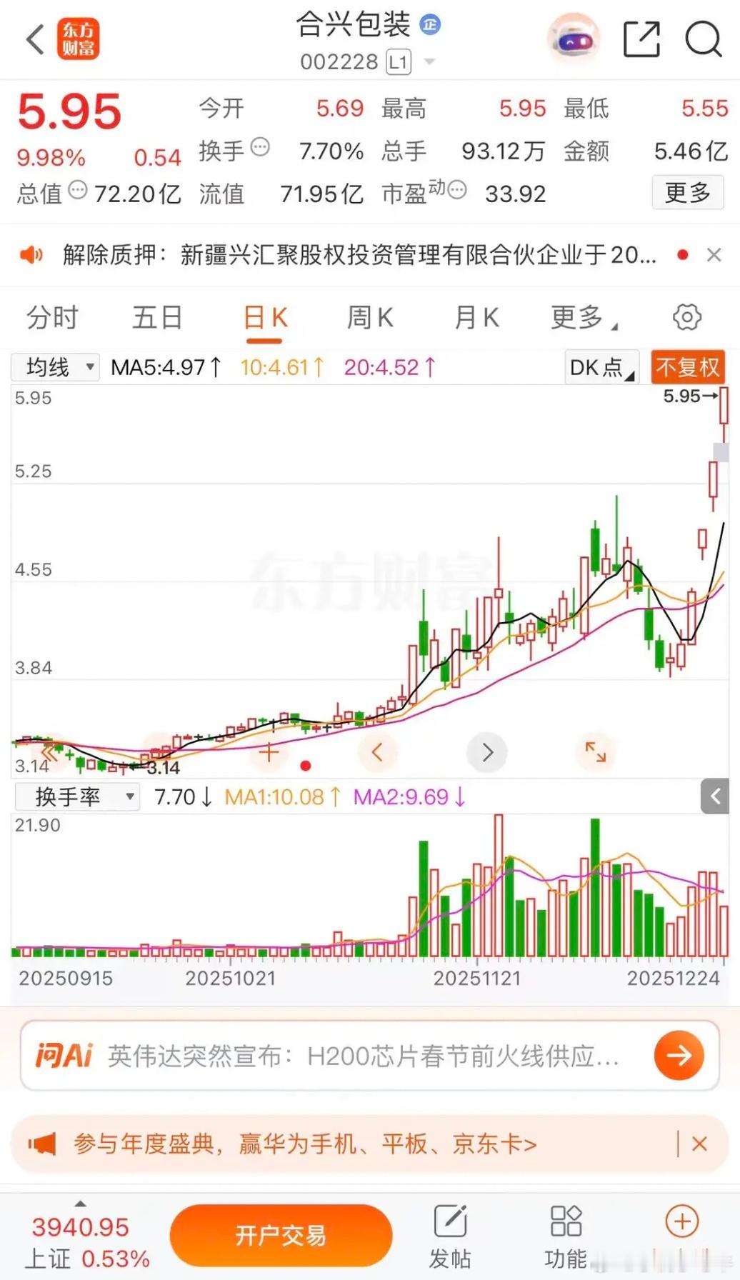 航天发展创新高,东百集团创新高,合兴包装低价后起之秀航天发展涨幅达到9.34%,差点涨停板,收盘报收24.93元每股,成交金额119.5亿元,强势不可挡。东百集团涨停板收盘报收21.45元每股,成交金额46.67亿元,促消费大牛股。合兴包装涨停板收盘报收5.95元每股,成交金额5.46亿元,3连板涨停,4连板可期,低价股成妖,强强强。