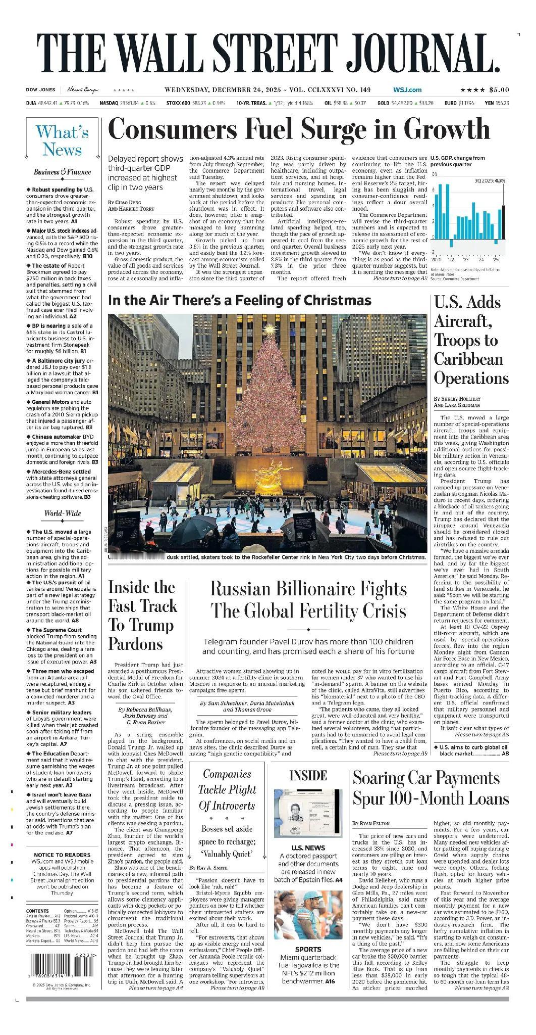 《华尔街日报》头版报道称,美国在加勒比地区行动中增派飞机和部队。 据美国官员和公开的航班追踪数据,美国本周向加勒比地区调运了大量特种作战飞机、部队和装备,这为华盛顿在委内瑞拉采取可能的军事行动提供了更多选择。 特朗普总统近日加大了对委内瑞拉强人尼古拉斯·马杜罗的压力,下令封锁进出该国的油轮。特朗普宣称委内瑞拉周边空域应被视为封闭区域,且不排除对该国进行空袭。 他周一表示:“我们组建了一支庞大的舰队,这是我们有史以来最大的,也是目前在南美洲最大的。”谈及在委内瑞拉进行地面打击的可能性时,他说:“很快我们也会在地面展开同样的行动。” 一名官员称,至少10架供特种作战部队使用的CV-22“鱼鹰”倾转旋翼机周一晚间从新墨西哥州的坎农空军基地飞往该地区。根据航班追踪数据,来自斯图尔特堡和坎贝尔堡陆军基地的C-17运输机周一抵达波多黎各。 另一名美国官员证实,军事人员和装备通过飞机运输。 目前尚不清楚运输了哪些类型的。 该报关注了,消费者推动增长激增 。 延迟发布的报告显示第三季度国内生产总值(GDP)以两年来的最高速度增长, 美国商务部周二表示,经季节性调整后,7月至9月的年化增长率为4.3%。 该报告因政府停摆推迟了近两个月,回顾的是停摆生效前的时期。不过,它确实提供了一幅本年度大部分时间都在持续运转的经济快照。 2023年。消费者支出增长部分由医疗保健推动,包括门诊服务以及医院和疗养院的支出。国际旅行、法律服务以及个人电脑和软件等产品的支出也有贡献。 有证据表明,尽管通胀仍高于美联储2%的目标,招聘一直低迷,消费者信心指数反映出总体情绪低迷,但消费者仍在继续推动美国经济增长。 美国消费者的强劲支出推动了第三季度经济扩张超过预期,达到两年来最强劲的增长率。 与人工智能相关的支出也起到了推动作用,尽管增长速度似乎比第二季度有所放缓。第三季度整体商业投资增长从前三个月的7.3%放缓至2.8%。 美国商务部将修订第三季度数据,预计明年初发布其对2025年剩余时间经济增长的评估。 国内生产总值(GDP),即整个经济中生产的所有商品和服务的价值,经季节性调整和通胀调整后增长。 增长率从上一季度的3.8%上升,轻松超过了《华尔街日报》调查的经济学家预测的3.2%。