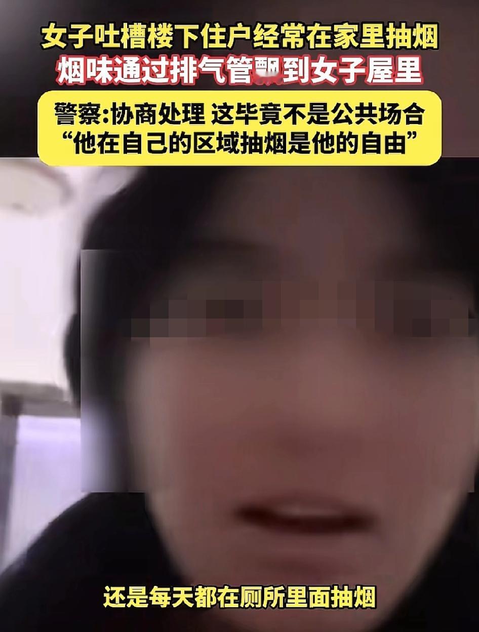 四川一女子吐槽楼下的男子经常在厕所房间里抽烟,因为烟味会通过排风系统一直冲上自己家的窗户非常难受,多次协商无果,女子选择报警处理,但是给出的结果是一位男子不是在公共场合抽烟,而是在自己的区域里,这是他的自由,只能协商处理。