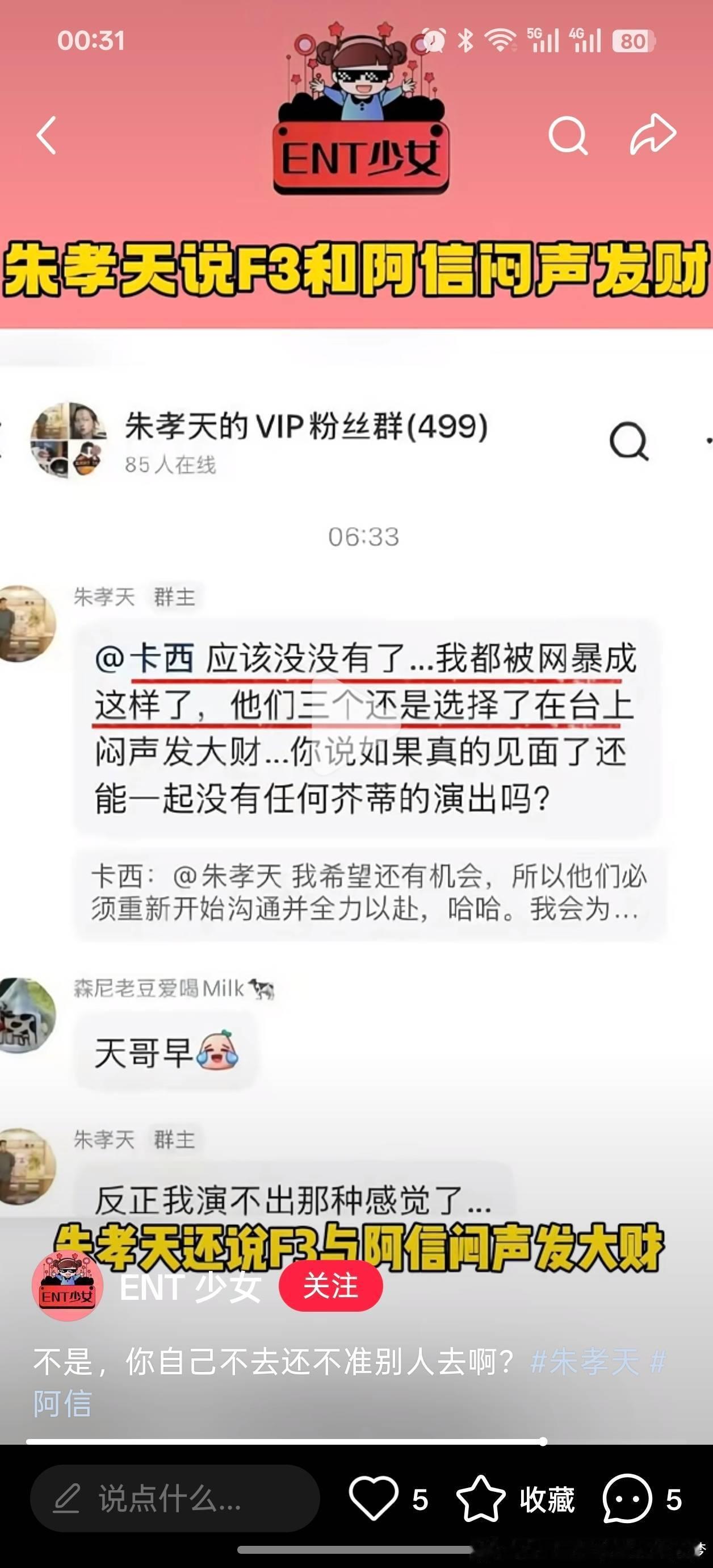 可是不是朱孝天自己说的和其他三个人不熟么,既然不熟,只是同事关系,那你自己不赚钱,怎么还不让别人上班赚钱了???别人赚钱为什么要考虑你的感受呢?这什么想法和逻辑嘛……