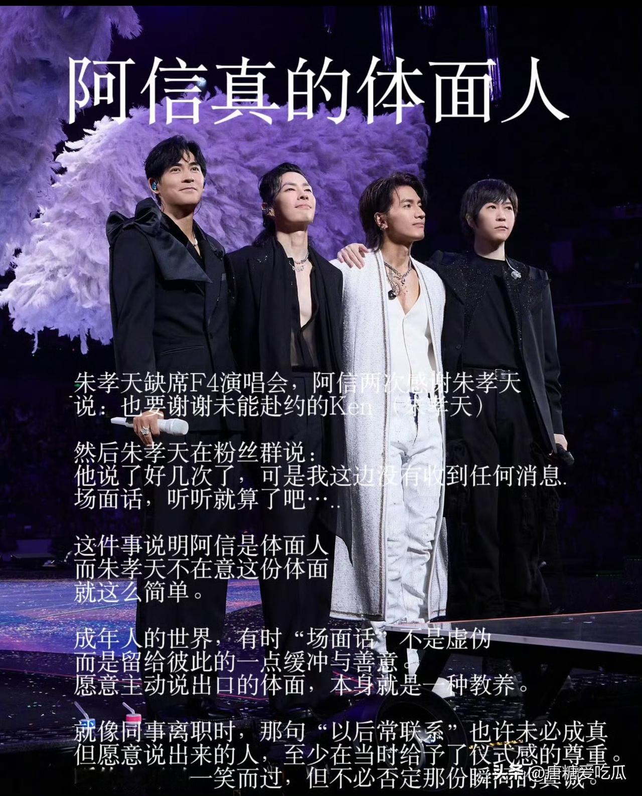 原来朱孝天不能原谅的是阿信 我是万万没想到 他竟然不是因为f3 而生气,是因为阿信才如此别扭。 一直都想说他怎么那么酸,明明阿信给了他百分之百的体面,但是他一直在拆台,不给阿信一点面子,这次直接说阿信公司和黄牛合作,不管是真是假,反正是彻底撕破脸了。 朱孝天可能愿意接受f3 开演唱会,但是也不愿意看到有另一个人的f4吧,阿信动了他最不能容忍的东西。