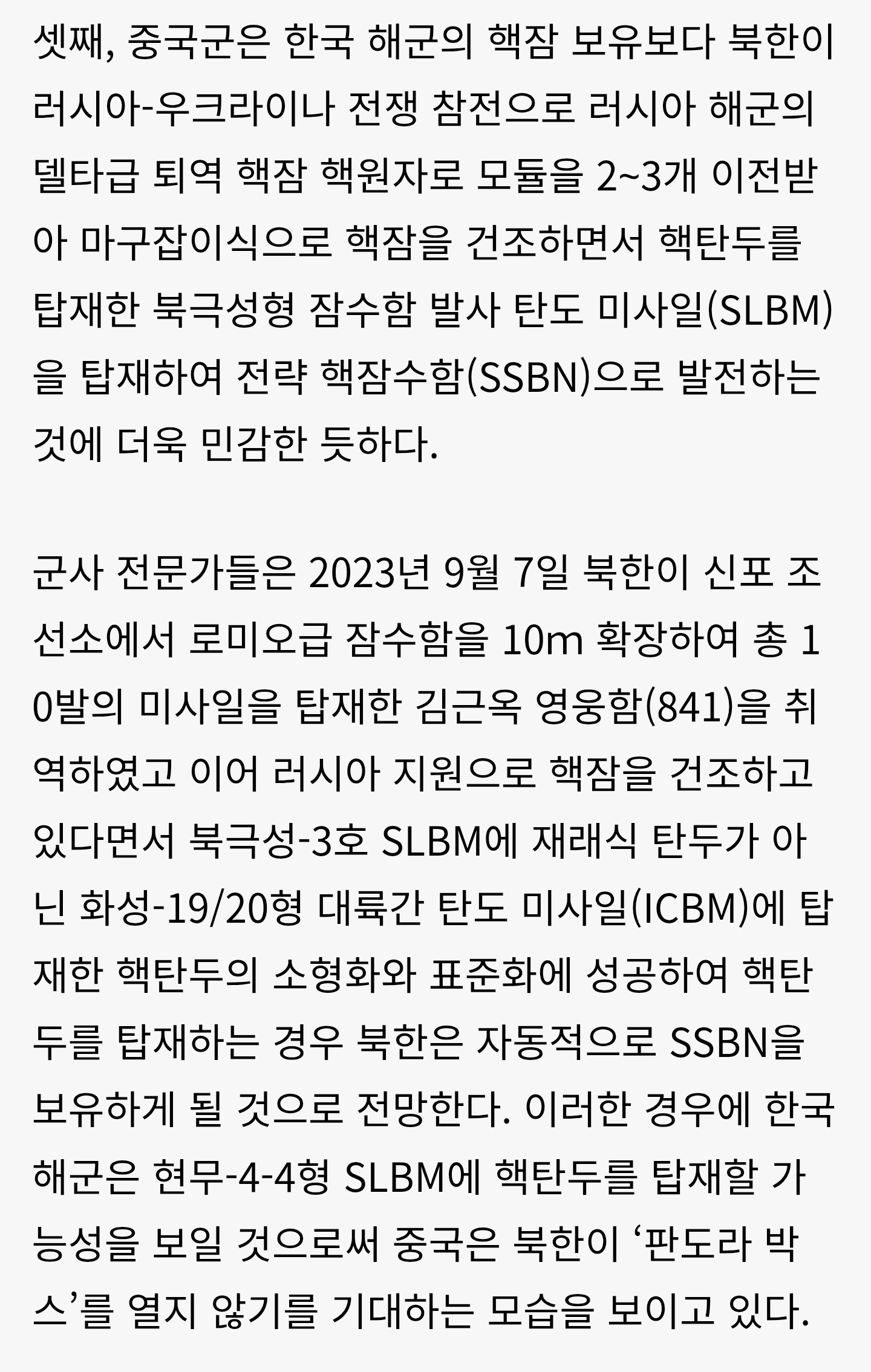 朝鲜领导人金正恩视察正在建造中的弹道导弹核潜艇,根据韩国媒体报道:朝鲜因参与俄乌战争而获得两到三个俄罗斯海军退役的德尔塔级核潜艇反应堆模块,借此以“拼凑式”的方式建造核潜艇,并搭载可装配核弹头的北极星型潜射弹道导弹(SLBM),从而发展为战略核潜艇(SSBN)。每天认识一件兵器烽火问鼎计划 【图7和图8】2023年9月7日,朝鲜在新浦造船厂将一艘罗密欧级潜艇加长10米,改装为可搭载共10枚导弹的“金君玉英雄艇”(841号);并认为在此基础上,如果朝鲜在俄罗斯的支援下正在建造核潜艇,同时在【图9】“北极星-3型”SLBM上成功实现核弹头的再入技术,那么朝鲜将具备二次核反击能力。