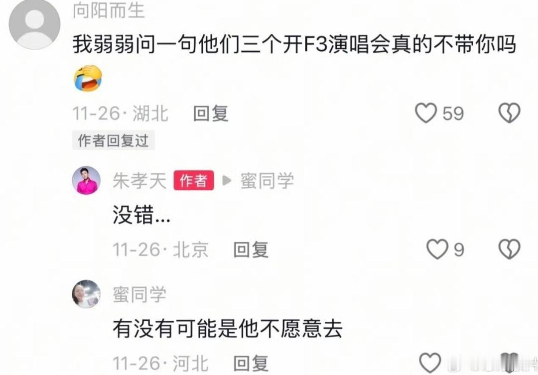 这瓜有点意思。阿信在F4演唱会上两次cue朱孝天,还说“日子还长,会等到你们期待的阵容”,听起来像给足面子的台阶。结果朱孝天转头在粉丝群回怼:“他说了好几次了,我这边没收到任何消息……场面话听听就算了。”网友瞬间炸锅:你这是把台阶当跳板,直接跳楼啊!有人劝他专心当网红,F3也挺好。你觉得是真没沟通,还是故意开撕?