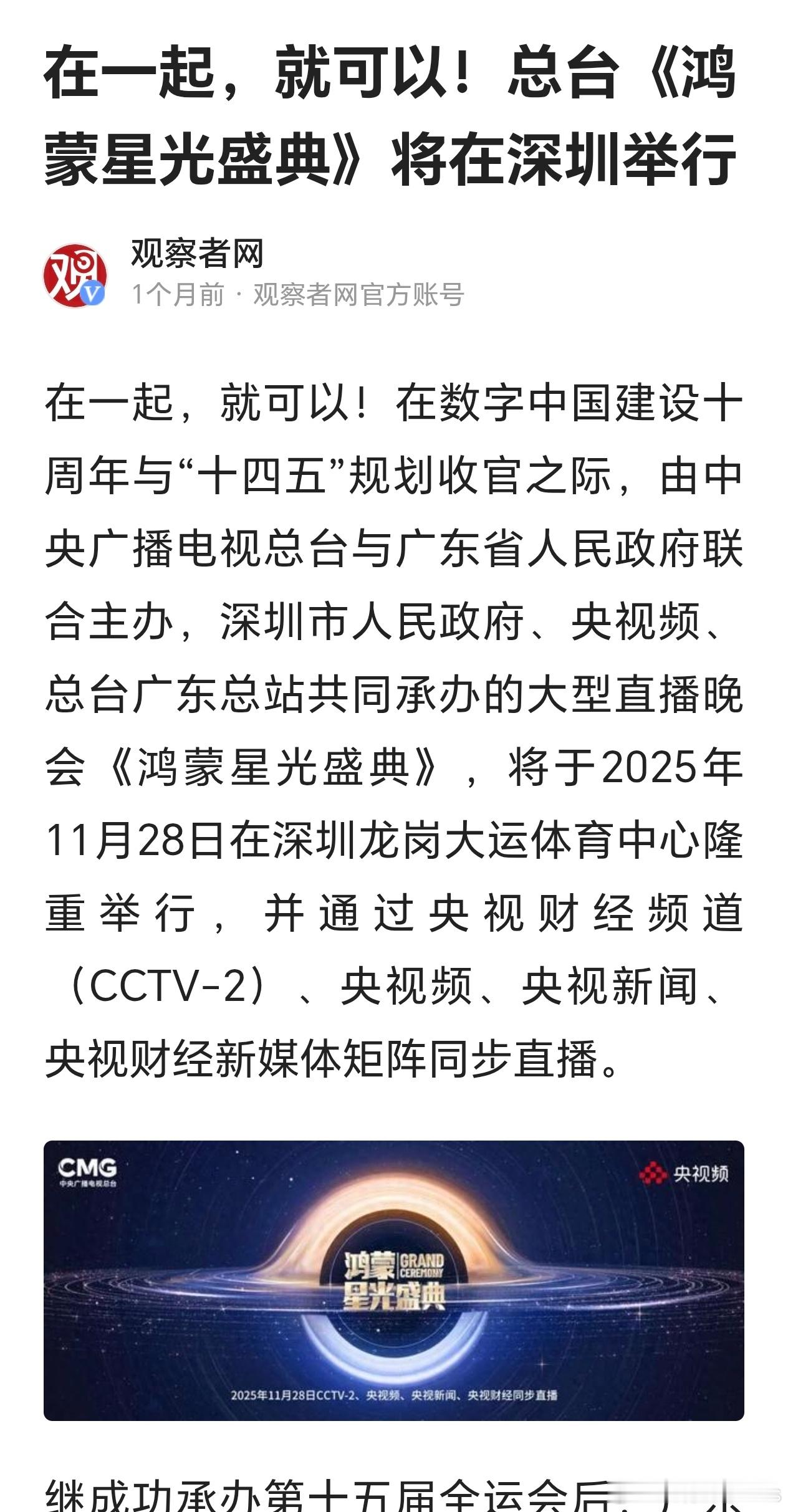 鸿蒙星光盛典由由中央广播电视总台与广东省人民政府联合主办,深圳市人民政府、央视频