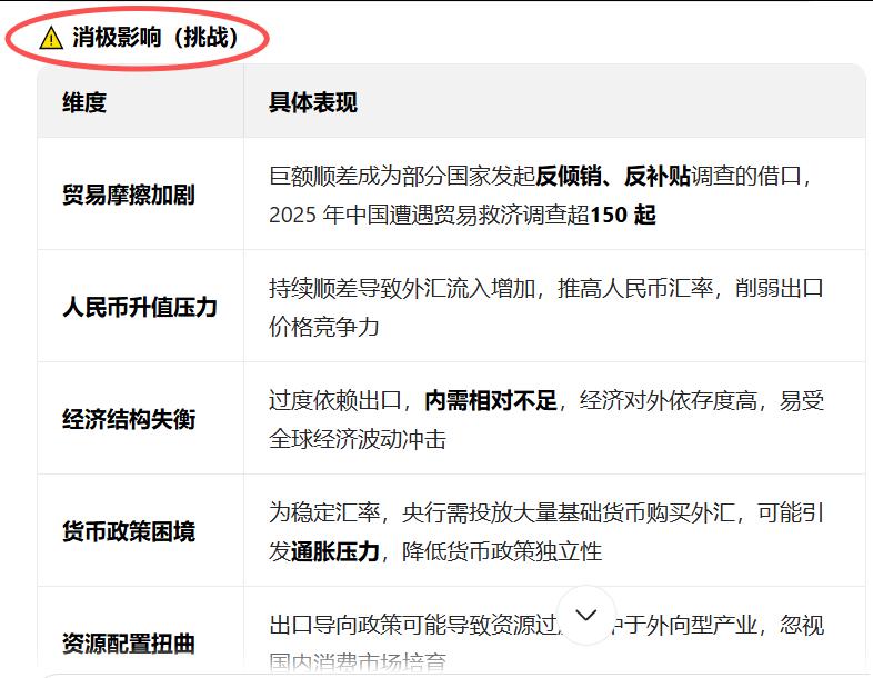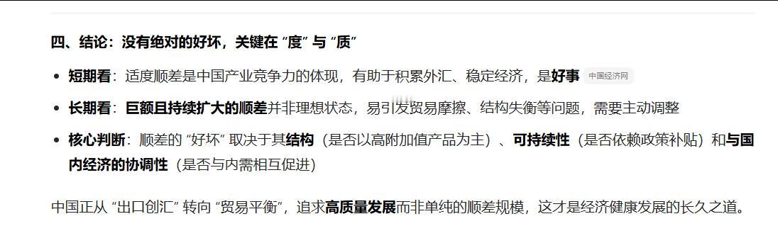 中国的贸易顺差突破一万元美元,是好事还是坏事?这是把双刃剑,短期看是好事,中远期看是坏事。过于依赖外贸,国际树敌多,内需始终没有达到理想的状态,顺差态度会造成通货膨胀,对内循环负面影响。希望积极构建完善合理的资源与收入的分配制度,缩小贫富差距。