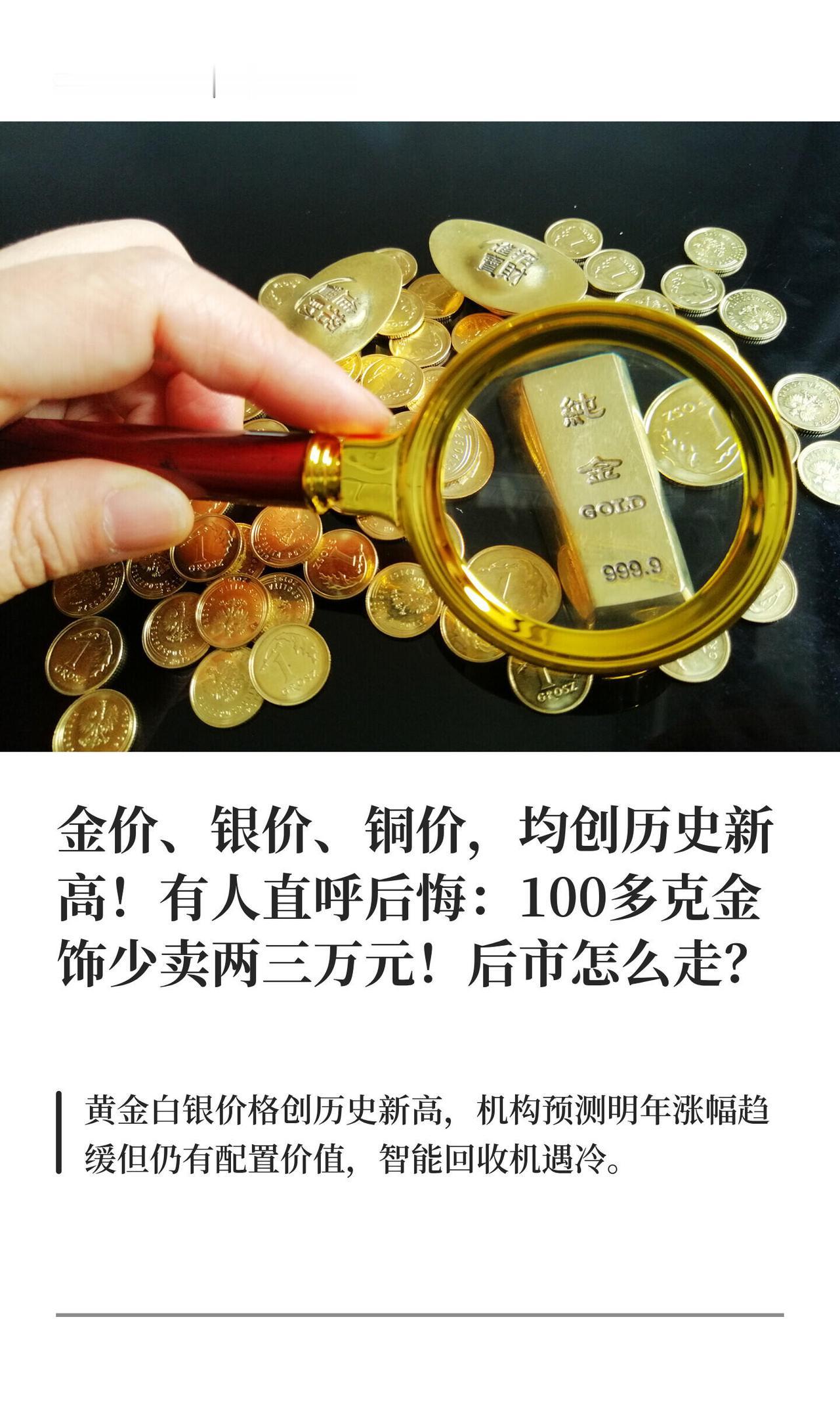 金银铜最近涨疯了,简直像坐火箭。 就12月24日那天,现货黄金价格又创了历史新高,冲到每盎司4525美元以上。算下来今年金价涨了快1900美元,涨幅超过70%,这速度太吓人。 白银也跟涨,当天盘中摸到每盎司72块多,也创了新高。另一边,铜价也爆了,伦敦那边历史上第一次突破每吨12000美元。有人说是因为全球好几个大矿停产,供应少了,加上特朗普那边可能搞新关税,市场有点紧张,一起把价格推了上去。 涨这么猛,有人欢喜有人愁。像一位黄女士,12月23号她通过回收机卖掉了存了好多年的100多克旧金饰,现在肠子都悔青了。她说款式老了,孩子也不喜欢,想着换成现金更灵活,也能给晚辈存点。结果卖掉才4个月,金价一克就涨了200多,算下来少卖了两三万块,直呼“没想到涨这么快”。 这行情真是让人看不懂。以前都说黄金稳,现在这涨法,反而让人心里有点打鼓。大家跟风买金买银的时候,也多留个心眼,别光看涨得猛,风险也是在涨的。