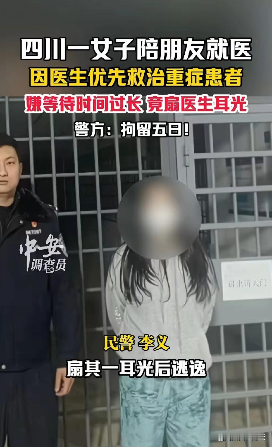 四川西昌,医生正在工作,一个女子从医生背后走过来,上来就给了医生重重的一记耳光。医生被打的一脸懵,都不知道自己怎么得罪她了。 原来,打人的女子是陪朋友来看病的。她看到医生优先救治了危重的病人,让她们等的时间长了。就不服气了,就打医生给朋友出气。 她这一耳光打下来,自己是舒服了。可是后果也是严重的,医生报警,女子被拘留5天。 网友看到处罚决定后,都大呼解气。 也有网友认为,处罚还是太轻。她出来可能也会引以为傲。就是医生太倒霉了,哪家医院不都是先救治危重病人。这个女人太无知了。 对于这件事,你怎么看呢?