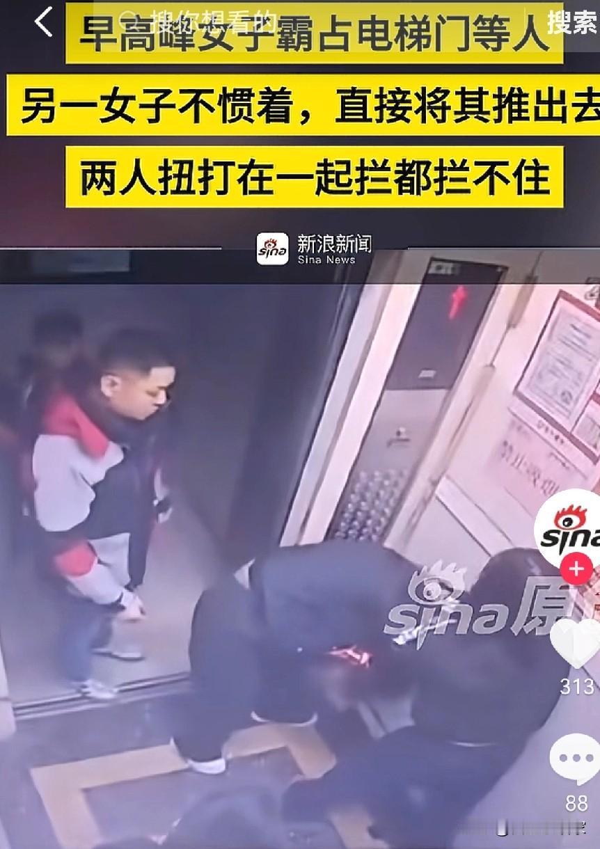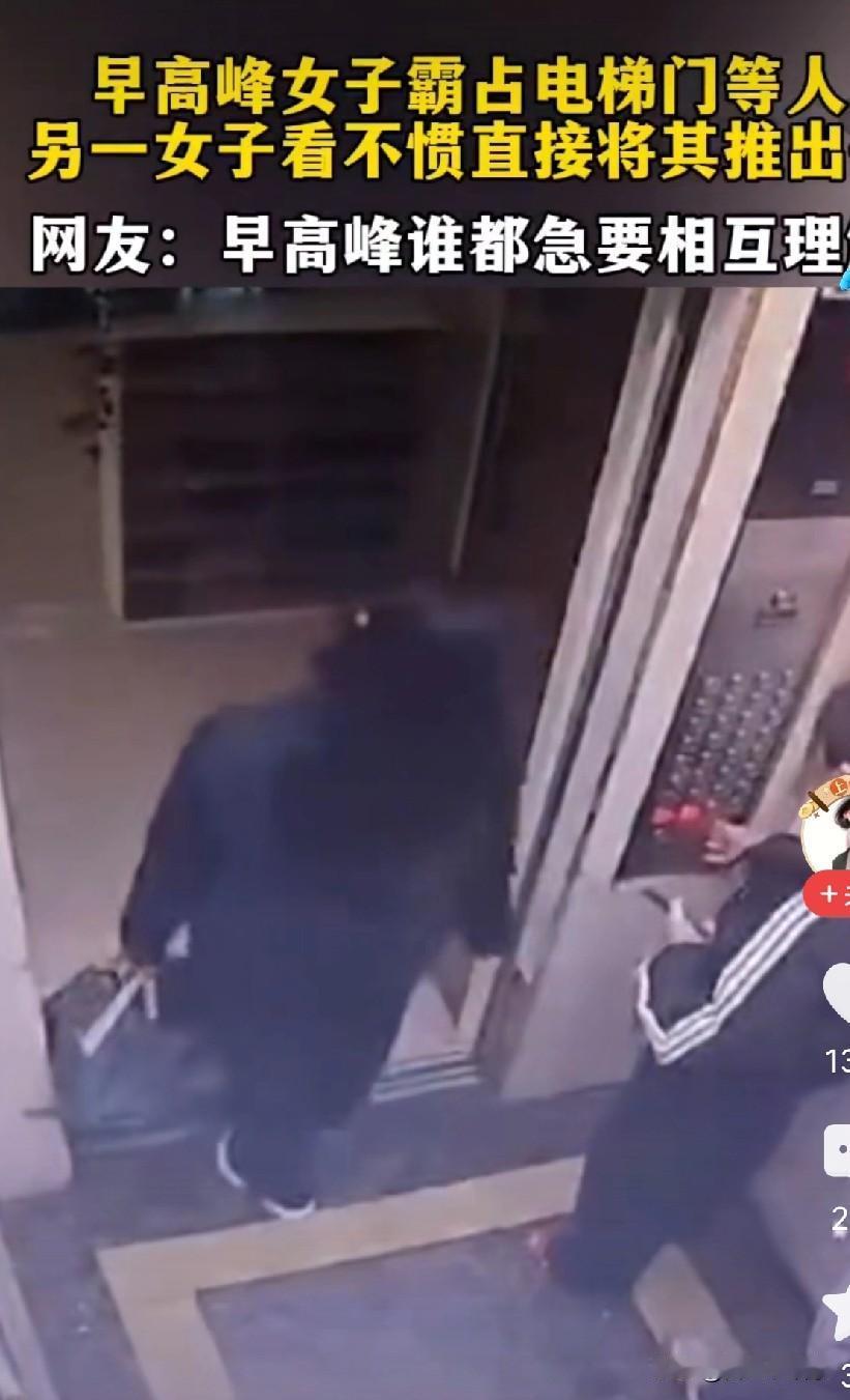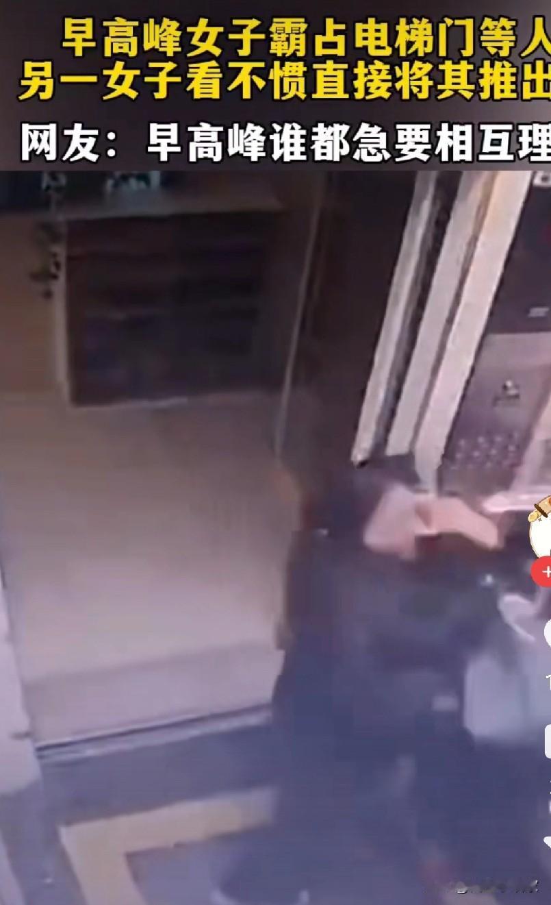 搭电梯搭电梯,在哪等不是等,非要在早高峰大家上班上学的时候,按着电梯等人,这下挨揍了吧。 近日,一女子又霸占着电梯,站在电梯门口的中间,电梯里一送孩子的宝妈,还有一快递小哥。 宝妈掏出手机看着时间点问女子到底走不走,女子说要等人。宝妈二话不说直接把女子推出去。这时候女子不甘示弱追进了电梯和宝妈打了起来,后面的快递小哥拉扯着两人劝其不要打架。 可惜女人发怒的时候谁劝都没用,两个人扭打在一起,直到霸占电梯的女子落败而告终。 这事一出,网友们直接吵翻了天。有人说宝妈做得对,对付这种没公德心的人,就该用“硬手段”,早高峰的电梯不是某个人的专属。也有人觉得,动手总归是不对的,再怎么生气也不该打人,万一打出问题,得不偿失。 你觉得,这事到底是谁的错?遇到这种占着电梯等人的,到底该忍气吞声,还是直接开怼?