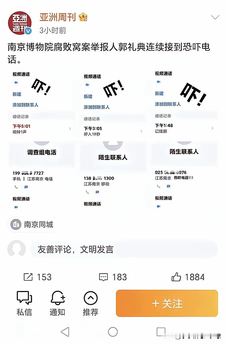 南京博物院的事件有了进展《亚洲周刊》刊登图文,剧终。 庞家后人追查捐赠文物, 南京博物院职工郭礼典再次实名举报徐湖平。 据《亚洲周刊》报道,调查组已经找郭礼典询问。 《亚洲周刊》还爆出了对郭礼典的恐吓电话。这些恐吓电话,都是谁打的,最后都会给出答案。江苏国宝 南博文物丑闻 南京国家文物
