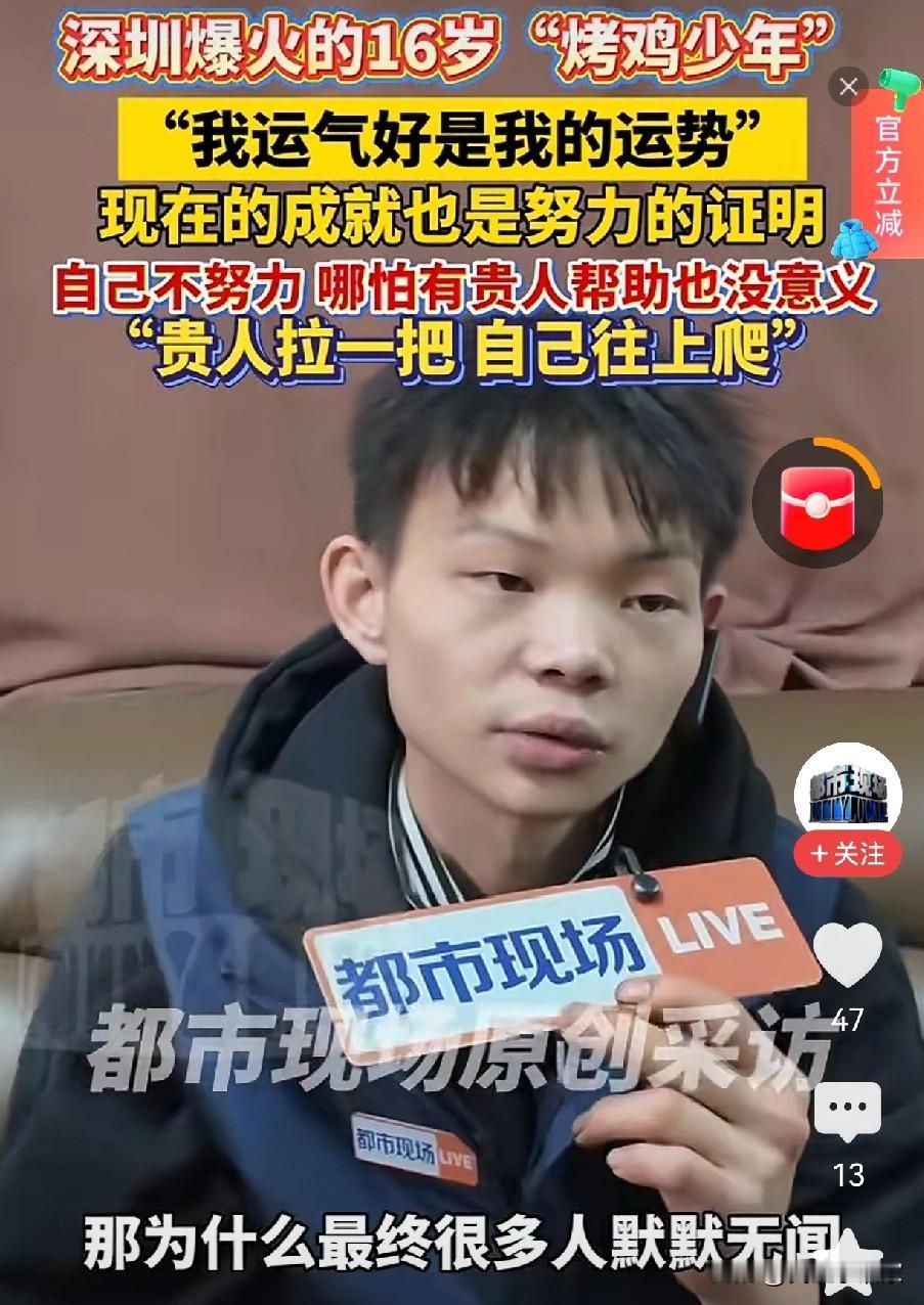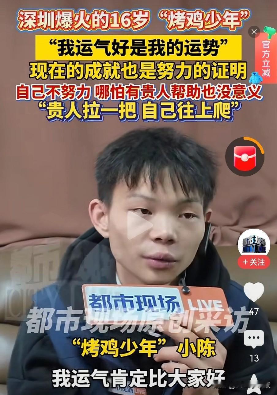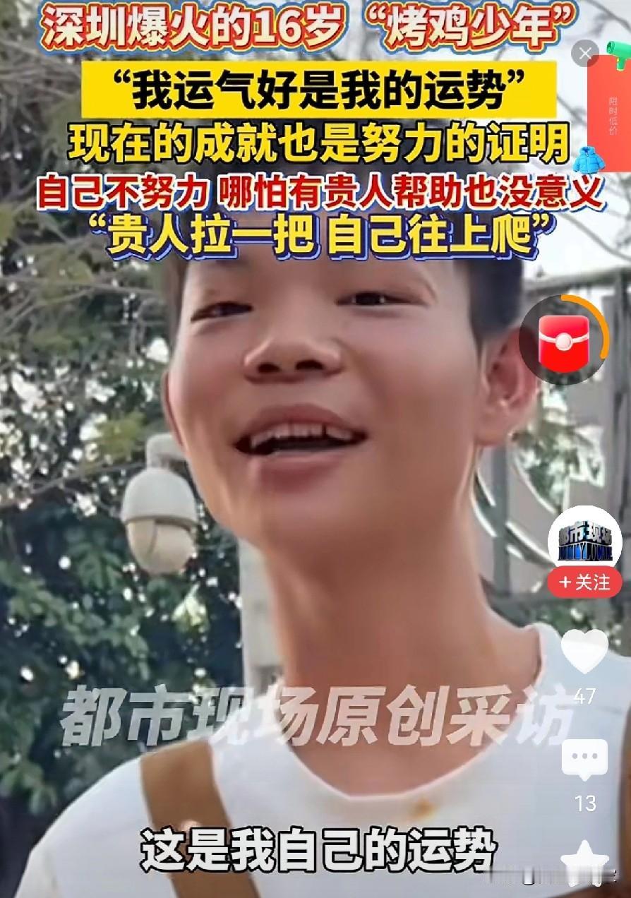 该说不说,“烤鸡少年”小陈还真算得上一个人间清醒,这16岁的年纪都跟不上他跨度的思维,这哪里是一个才十几岁孩子说出来的话。 近日的采访里,他说自己的成功靠的就是“贵人拉一把,自己再往上爬”,这是自己的运势。网红也采访了很多人,为什么别人没红没火,偏偏成就了他呢?这就是每个人努力的方向不一样。 我突然觉得这孩子说的对啊,给你机会抓不抓的住,这就是另外的故事了。互联网现在紧跟在那些流量高的“大咖”屁股后面跑,他们去敲哪家的门,后面就跟风一堆人,前有郭有才,鸡排哥,蛋烘糕阿婆,后有现在的烤鸡少年,将来还有无数个麻辣姐姐,炒饭小子。 冰川王曾经说过,互联网就是这样,每隔一段时间就会推一个新人出来,流量像一阵风,来得快去得也快。但真正能在这阵风里站稳脚跟的,永远是那些清醒、努力、懂得把握机会的人。 那么,问题来了:在这个流量瞬息万变的时代,一个普通人想真正“出圈”,到底是靠运气,还是靠自身的实力与努力?你怎么看?
