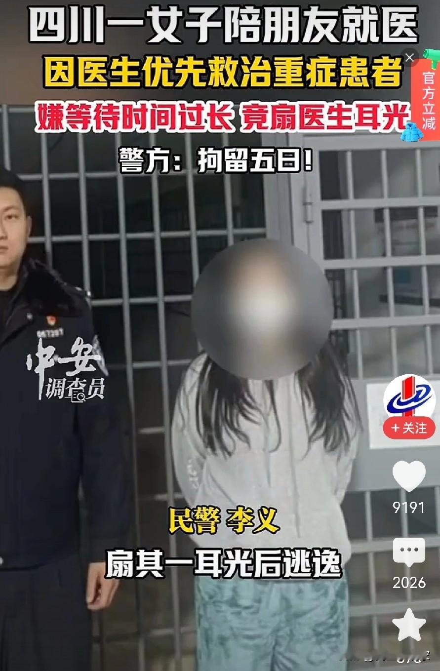 见过大胆的没见过这么大胆的,一女子突然跑到医生办公室,“啪”的一声,一耳瓜朝着一医生利落的打去,整个办公室都懵逼了。 12月24日西昌,在某医院,一年轻女子陪着朋友等医生喊号就医,中途她看到医生居然没先给她的朋友看病,而是给病情严重的病人先查看病情。 该女子觉得不公平,都是病人怎么不按套路出牌,在等待的过程中,她越想越不舒服,居然跑到医生后面偷袭,给正在电脑前疾速下诊断书的医生,狠狠一记耳光。 好了,这下不用看病了,等待她的是拘留5日的代价。这事一曝光,网友们也看蒙了,一个等待五分钟换来等待5日的拘留,还留案底,值得吗? 医生救死扶伤已经够累了,优先处理急症患者是基本的诊疗原则,怎么还要平白受这窝囊气?也有人钻牛角尖,觉得医院就该严格按号叫人,不管病情轻重都得一视同仁,这样才算真正的公平。更有人愤愤不平,直言拘留5日实在太轻了,正是因为暴力伤医的违法成本太低,才会有人敢这么肆无忌惮地对医护人员动手。 那么问题来了:医院遇到急症患者,到底该优先救治还是严格按号就诊?面对这种动手打人的患者,5日拘留的处罚力度到底够不够? (图片来自网络视频)
