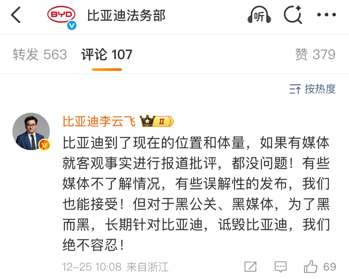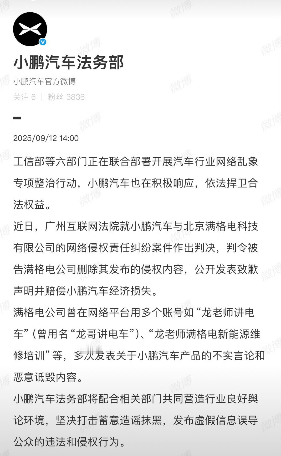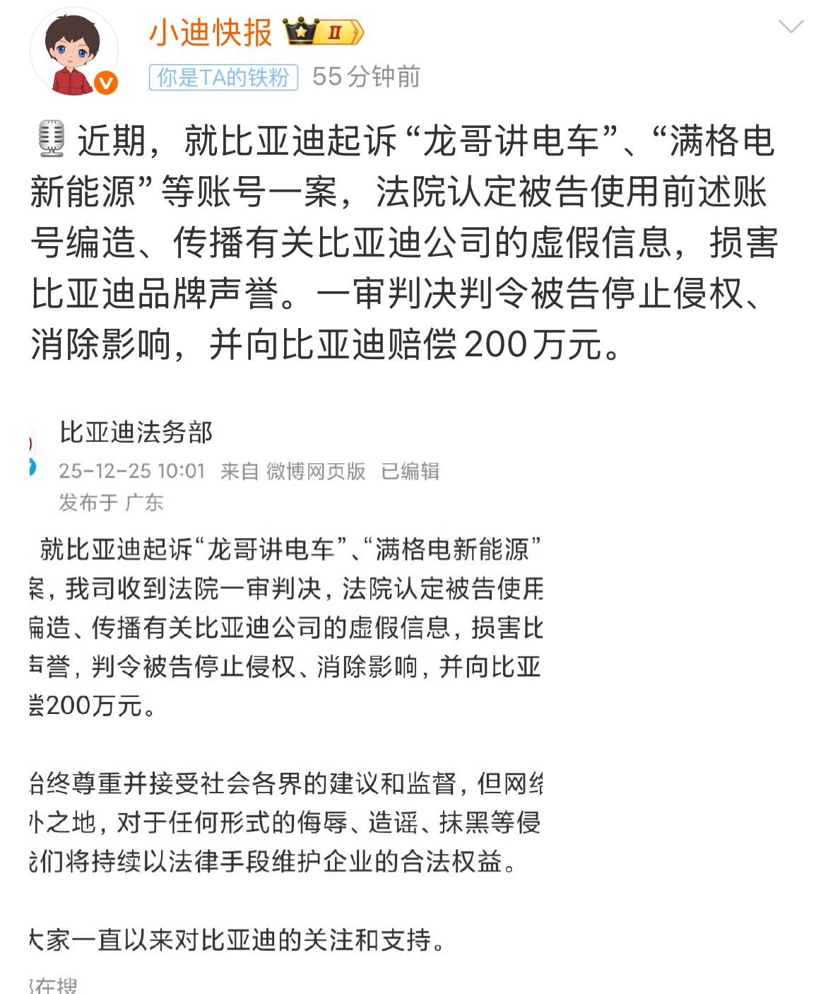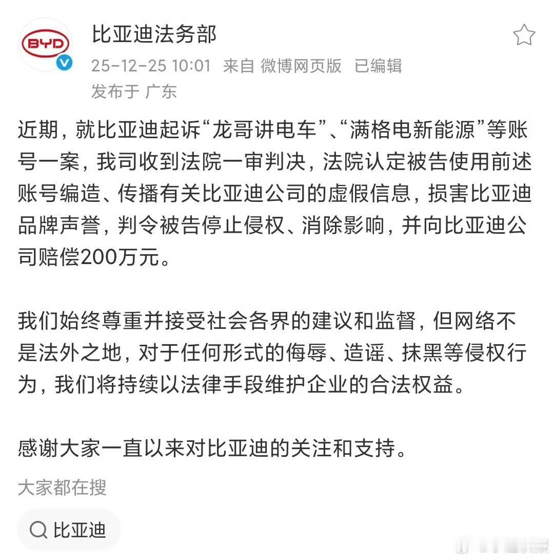 近期,就比亚迪起诉“龙哥讲电车”、“满格电新能源”等账号一案,我司收到法院一审判决,法院认定被告使用前述账号编造、传播有关比亚迪公司的虚假信息,损害比亚迪品牌声誉,判令被告停止侵权、消除影响,并向比亚迪公司赔偿200万元。 这位“龙哥讲电车”之前还诋毁过小鹏汽车,“因多次发布恶意诋毁、不实内容,被广州互联网法院认定为侵害小鹏汽车名誉权,判令其删除案涉侵权视频,公开发表致歉声明,并赔偿损失。” 这次比亚迪算不算直接捅了大动脉了~ 从多年前开始,汽车市场就已经迎来了一大波关于媒体的洗牌,我觉得除了传统的媒体前辈们,比如说从报社或是电视台出来做自媒体的前辈,还有很多跨界的,数码圈,时尚圈,有些甚至是美食娱乐户外相结合的都想来汽车行业分一杯羹,实话实说确实涌现了很多的人才也为我们这些传统的汽车媒体传递了一种要多元化的声音。 虽然我们都知道这是一件赚钱的买卖,但如果刻意的去黑,去瞎编乱造去赢得流量,到头来都是害自己,因为其实大道理就是你做人还是要实诚,还是要真诚,弄虚作假用谎言去叠加谎言,到最后就是会被反噬。比亚迪 比亚迪法务