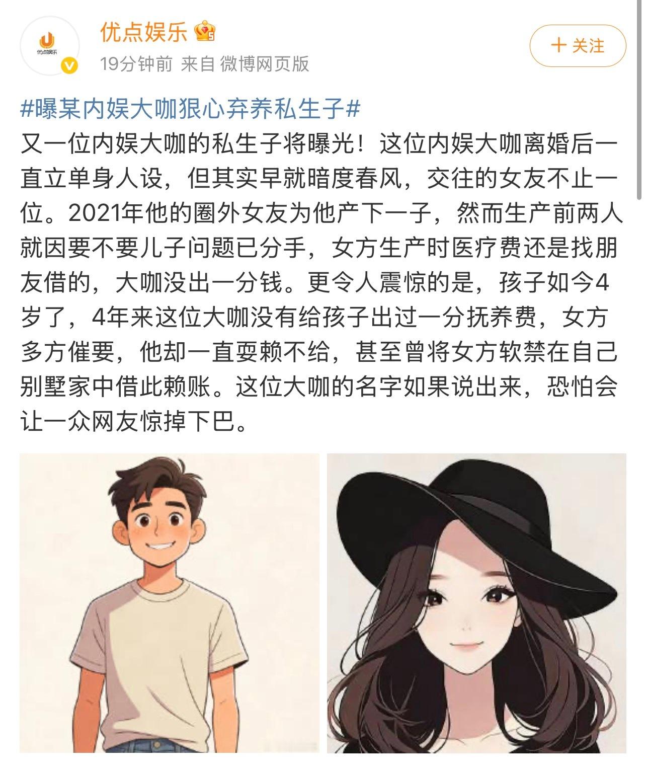 曝某内娱大咖狠心弃养私生子看明白了,内娱新孩子,离婚立单身的大咖男明星,21年交圈外女友。男的不要孩子,女的要,两人吵架分手后,女的自己生娃,男的不管。现在女的要生活费,男的不给,男的还将女的软禁别墅过。好眼熟的一套流程wsc2.0的感觉。这边建议女方直接起诉,网友不是法官。