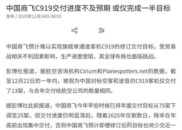 没想到对我们的影响这么大!美国这一出手还是很狠!12月24日,根据外媒报道,外媒称,中国商飞预计难以实现旗舰单通道客机C919的修订交付目标。受贸易战相关不利因素影响,中国商飞生产进度受阻,而其全球布局也面临挑战。 贸易战对C919交付造成直接冲击。2025年12月24日,外媒指出中国商用飞机公司难以完成C919调整后的交付数量。供应链中断是主要原因,特别是发动机部件供应不稳。美国政府5月下旬停止发放某些航空技术出口许可证,包括CFM国际公司的LEAP-1C引擎,这种由通用电气和赛峰集团合作的部件难以运抵。 公司年初将年度交付目标从75架降至25架,以应对风险。但实际进展慢,到9月底仅交付5架飞机。 12月22日,总交付数仅13架,远低于预期。贸易争端升级,出口审批延长,供应商拖延发货,导致零部件延误。全球市场扩展遇阻,潜在买家犹豫签约,因中美关系紧张。公司转向其他供应商,如欧洲企业,但合同谈判和兼容性验证耗时,导致进度放缓。 金融报告显示,国内航空公司预期32架,但实际远未达到。地缘政治因素加剧供应链约束,影响生产容量。C919依赖进口引擎,禁令直接打击交付计划。美国7月允许重启部分发货,但整体影响已成事实。 专家分析,贸易紧张直接拖累时间表,预计2025年交付18架,2026年25架。 这种局面暴露了对外依赖的风险,推动本土替代需求。 面对挑战,中国商用飞机公司加速长江1000A发动机研制。这种大涵道比涡扇引擎提升耐久性和燃料效率,目前进入认证测试阶段。2025年3月,航空发动机集团报告测试推进,收集数据优化参数。 吴光辉继续主导团队,推动技术升级,确保C919融入本土部件。研发处理材料采购到组装步骤,融入先进复合材料。 2025年4月,供应商确认即将空中测试,验证性能。项目推进积累数据,支持优化,计划挂载C919进行验证。整体努力减少外部依赖,实现国产化。中国航空工业正逐步迈向自主,贸易战虽带来压力,但也激发创新动力。未来展望中,C919交付将逐步恢复,全球布局扩展需时间。