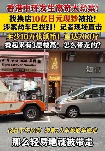 直击香港大劫案现场:4人持刀抢劫10亿日元,不少市民质疑10万张纸币重达200斤,如何迅速带走 12月18日,香港中环一家兑换店出事了。四个男子拿刀抢走了店里十亿日元现金,换成人民币就是四千五百万。现在警察抓了一个嫌犯,还有一辆车被找到,但另外三个人都没抓到。被抢的是四个店员,他们当时正用几个行李箱搬钱,箱子被抢后劫匪坐车跑了。 很多网友都在问一个问题:这么多钱怎么偷跑的?按最大的一万日元纸币算,光是纸张就有十万张,加起来有一百公斤重。有网友说这得有两个人才能扛动,而且纸币堆起来都能到三层楼那么高,怎么在大白天搬得动?还有的说可能分好多箱子,但这样也得有几个人一起抬。 警察现在在查一辆可疑车,在车上找到了指纹和其他证据。被抓的那个男的因为涉嫌抢劫被关在警局了,不过还有三个在逃。被抢的四个店员都没受伤,其中一个是内地来的,拿着港澳通行证,另一个是香港本地人。这案子现在归港岛那边的重案组管。 这事在网上吵翻了天。有网友自己去买了几沓钞票试试看,发现拿一两斤还行,到二十斤就手软了,更别说一百多斤了。有专家说可能钱被捆得很紧,分装成小包,或者车上有人帮忙分担。但不管怎么说,这么大笔钱要在闹市区偷走确实不容易。 现在警察还在找另外三个逃跑的人。他们用了什么路线,钱现在在哪里,这些都是谜。有邻居说看到过一辆可疑车停在附近,但不确定是不是劫匪的。警察调了监控,发现车可能往几个口岸方向跑了。 有人说兑换店平时不该让普通员工自己搬钱,应该请专业保安。现在香港很多地方已经用电子转账了,但还有一些行业非要用现金,尤其做跨国生意的。这次抢劫可能就是看准了这个漏洞。 案子破不了的话,这些钱可能会被换成其他东西转移。比如换成其他货币,或者买豪车、奢侈品快速出手。不过这么大一笔钱,想要不动声色地处理很难。警察现在应该也在查最近的大额交易。 网上有人说这事像电影桥段,现实中谁扛得动那么多重。但也有人指出,劫匪可能用其他办法,比如趁店员搬箱子的时候直接调包,或者用车直接运走。不过这些都只是猜测,得等警察公布更多证据才行。 现在那辆可疑车还在分析,指纹有没有匹配到其他人还不清楚。被抓的那个人会不会指认同伙,或者知道钱藏哪了,这都是关键。案件目前仍处于调查阶段,相关结果需等待进一步通报。